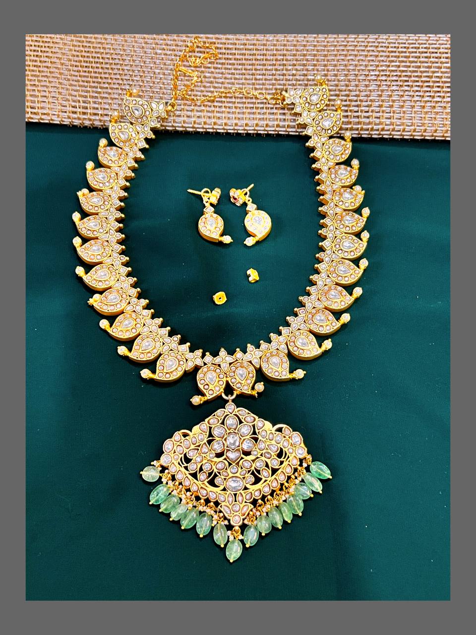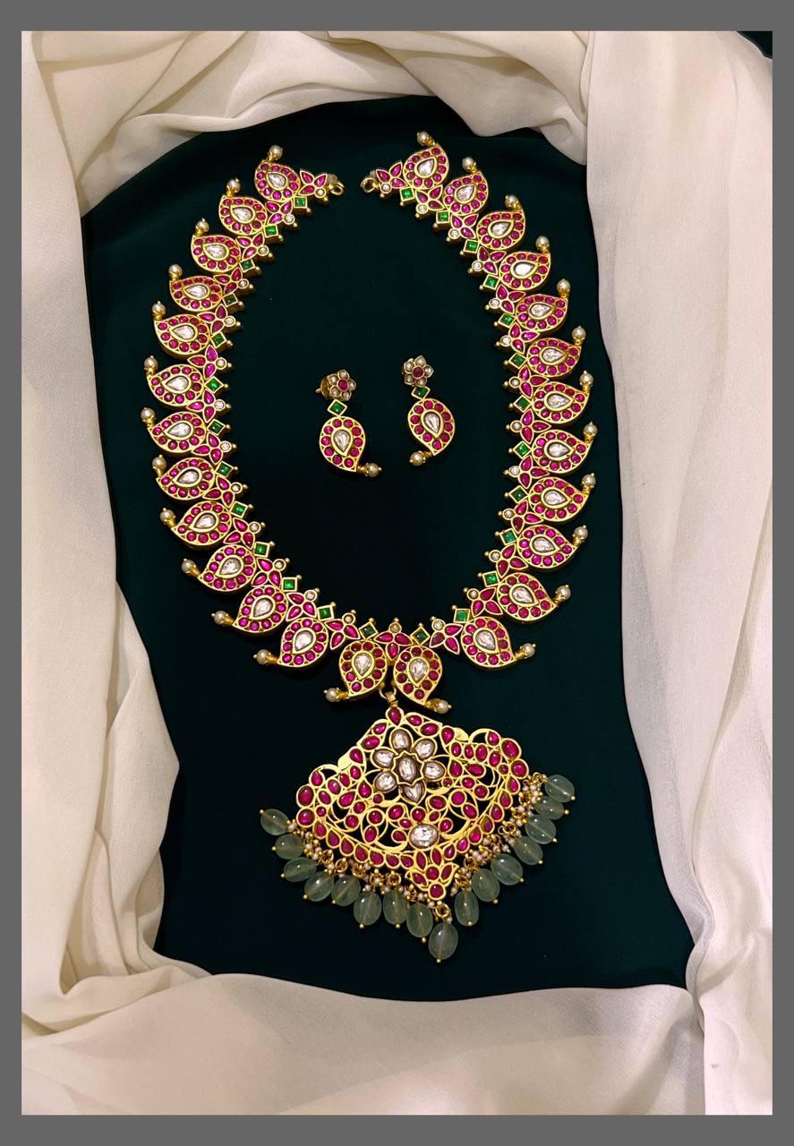 Add a splash of tradition with a twist! This 2 In 1 Mango Haram in Jadau lets you switch up your style effortlessly. Crafted with intricate Jadau work, its vibrant mango motifs bring a playful charm to any outfit. Perfect for those who love a little fun with their elegance!