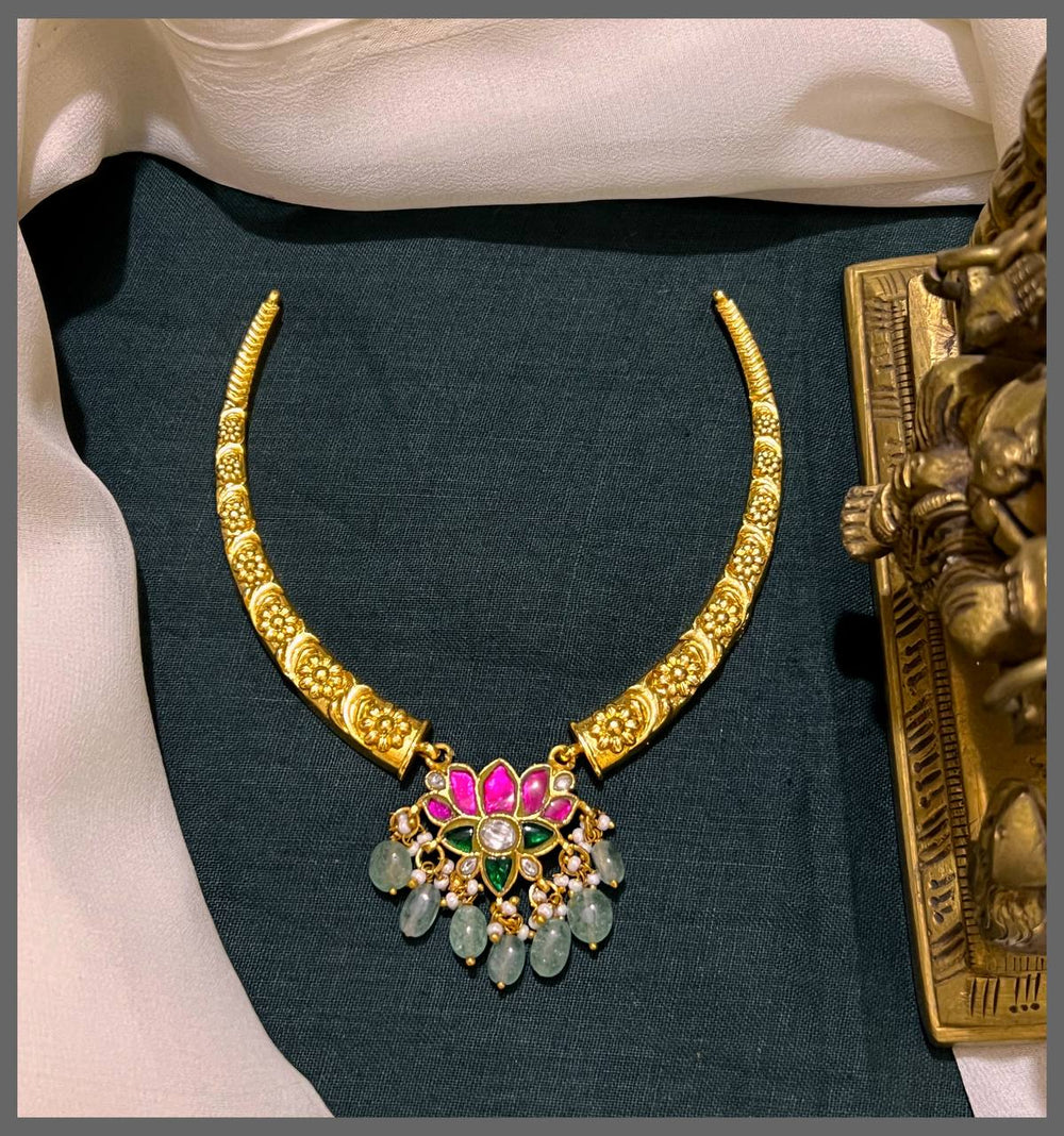 Elevate your traditional wardrobe with this exquisite Antic Kante, a timeless piece that celebrates heritage craftsmanship. Adorned with a vibrant multi-colour lotus design rendered in intricate Kundan work, this kante combines classic elegance with artistic brilliance. The lustrous finish and detailed embellishment make it perfect for festive occasions, weddings, and cultural celebrations. A versatile accessory that pairs beautifully with sarees and traditional attire, this piece is designed to make you feel confident and radiant. Invest in jewellery that tells a story of tradition and refined taste.