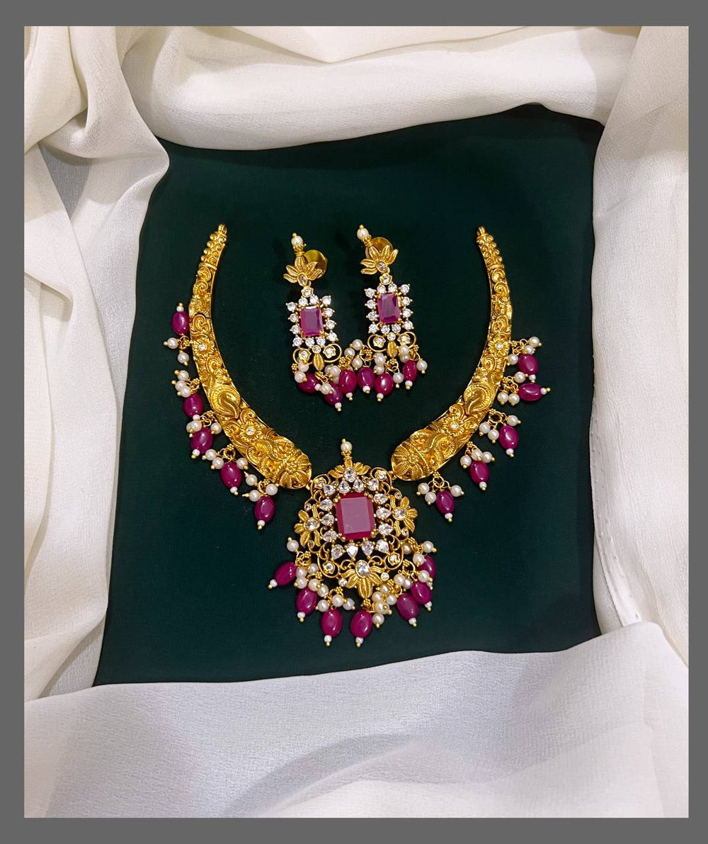 Elevate your traditional look with this exquisite Antic Kante necklace featuring delicate white pearls and pink accents in intricate Nakshi work. The timeless design blends vintage charm with elegant details, making it perfect for special occasions and cultural celebrations. This handcrafted piece adds a touch of heritage to any ensemble.