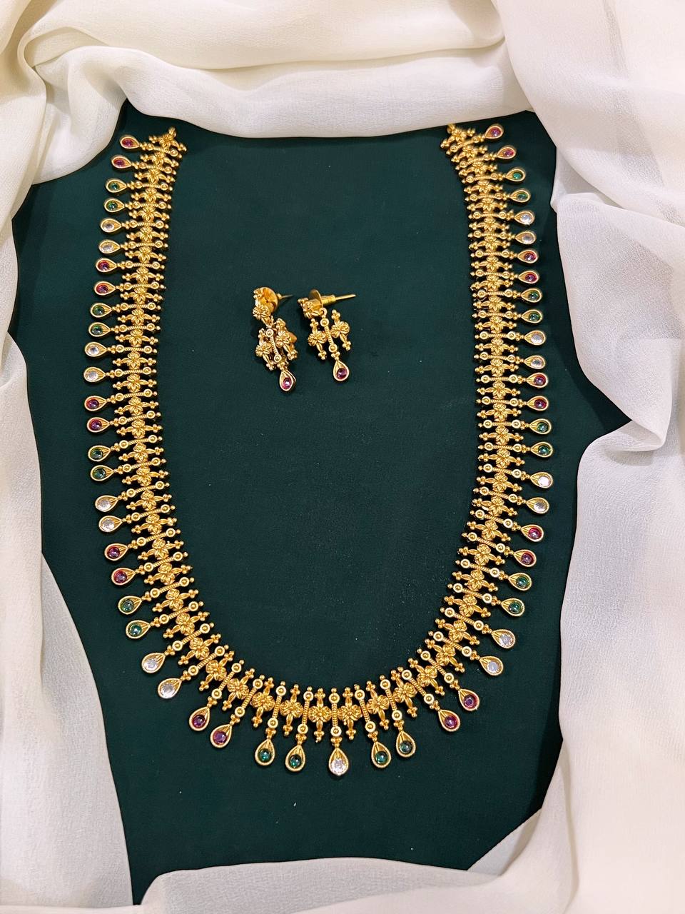 Expertly crafted with an antique finish, the Nakshi Haram NH0073 is simply elegant. Its intricate design showcases the artisan's mastery, ensuring a timeless and sophisticated look. Complete your ensemble with the included matching earrings for a truly statement-making set.