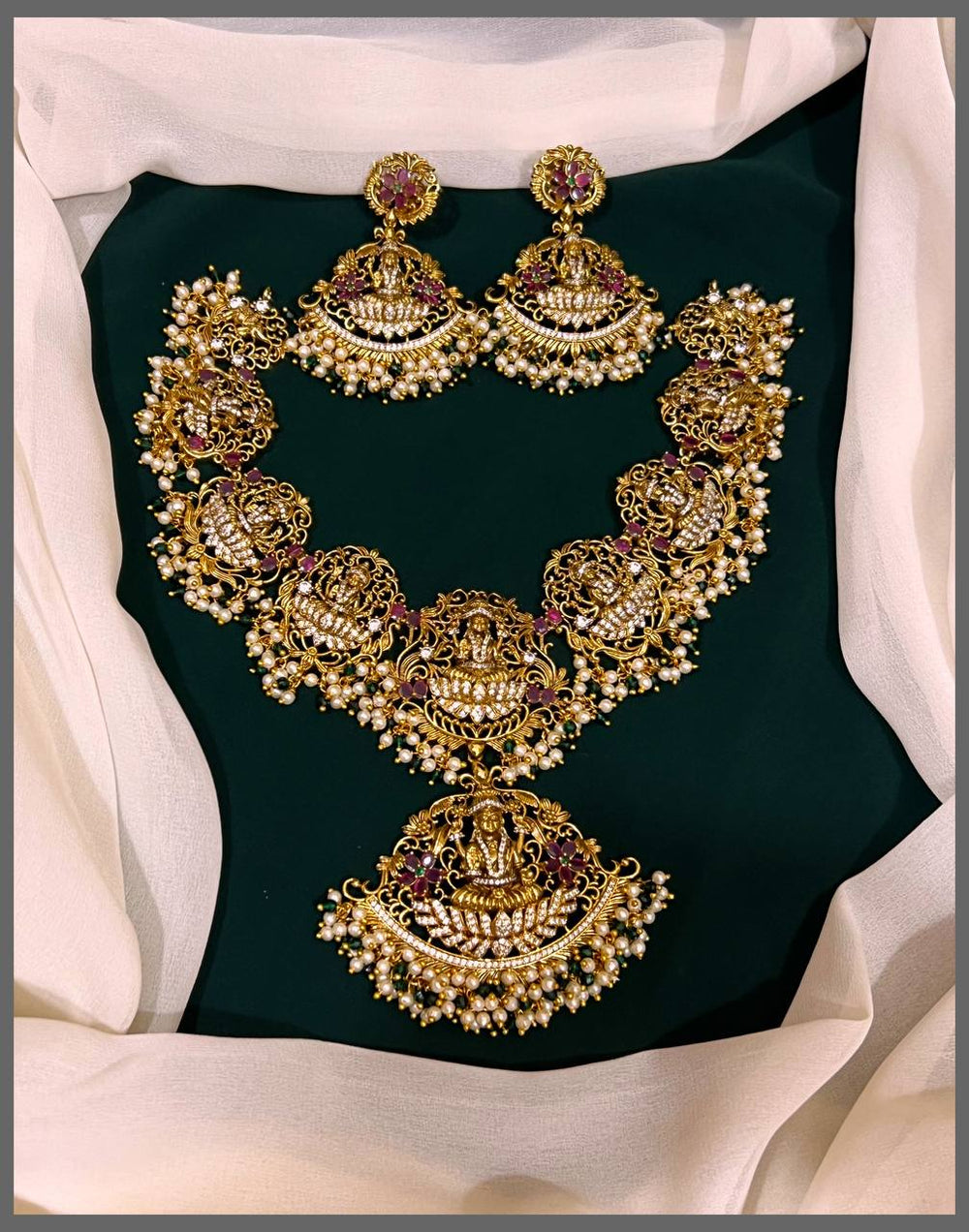 This Antique Lakshmi and Elephant Necklace beautifully blends traditional motifs with elegant pearls, symbolizing prosperity and strength. Its intricate design showcases the revered Lakshmi goddess alongside majestic elephants, making it a meaningful addition to any collection. Perfect for special occasions, this necklace adds a touch of heritage and grace to your attire, while the pearls offer timeless sophistication and charm. Embrace the cultural richness and supportive energy this piece brings to your jewelry ensemble.