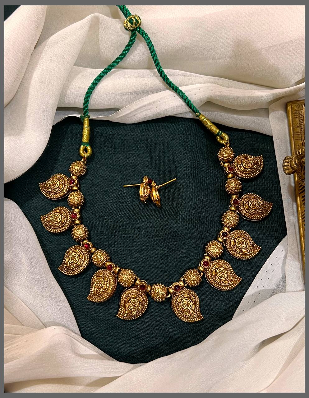 Celebrate timeless elegance with this exquisite Antique Mango Necklace, a masterpiece of traditional craftsmanship. Featuring the iconic mango pendant adorned with lustrous gold beads, this piece showcases authentic Nakshi work—an intricate hand-finishing technique that brings depth and character to every detail. The antique finish lends a vintage charm while maintaining contemporary appeal, making it versatile for both festive occasions and refined everyday wear. Perfect for those who appreciate heritage jewelry that tells a story of skilled artistry and cultural richness.