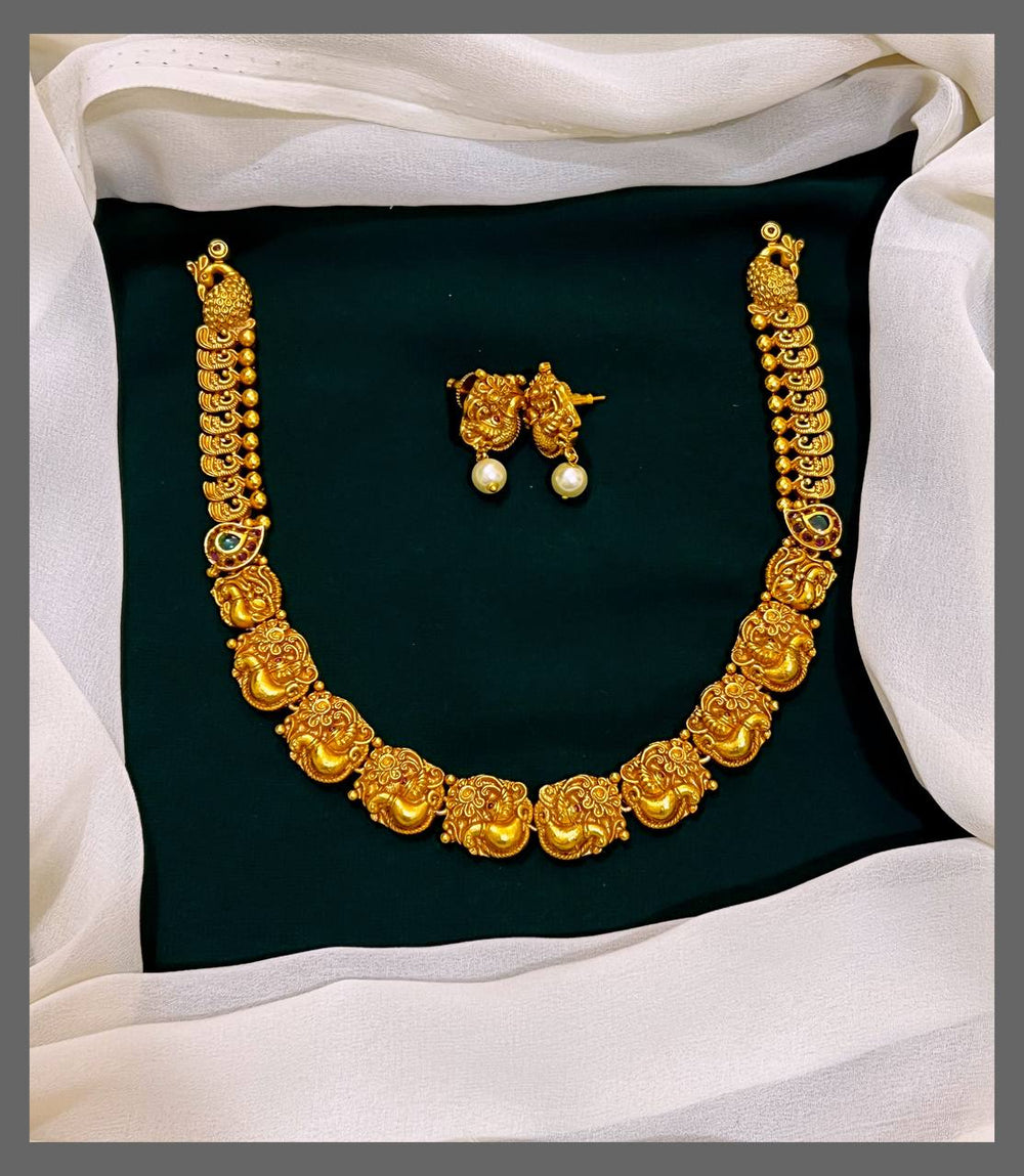 Celebrate timeless elegance with this exquisite Antique Peacock Necklace, crafted using traditional Nakshi techniques. The intricate peacock motif showcases masterful artisanal work, featuring delicate detailing that captures the majestic beauty of this iconic bird. Perfect for special occasions, festivals, or adding a touch of heritage to your everyday style, this necklace blends classic Indian craftsmanship with sophisticated design. A versatile piece that complements both traditional and contemporary wardrobes, it's an investment in enduring beauty and cultural artistry.