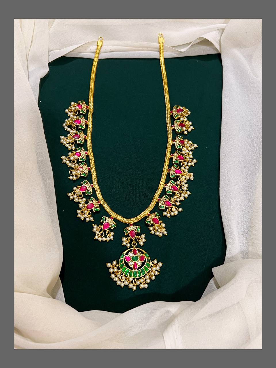 Add a touch of sparkle and tradition with this Beautiful Chand Bali Pendant Haram in Kundan. Its intricate design and shimmering kundan stones make it perfect for festive occasions or adding a playful charm to your everyday look. Lightweight and dazzling, it’s sure to turn heads and bring a joyful glow wherever you go!