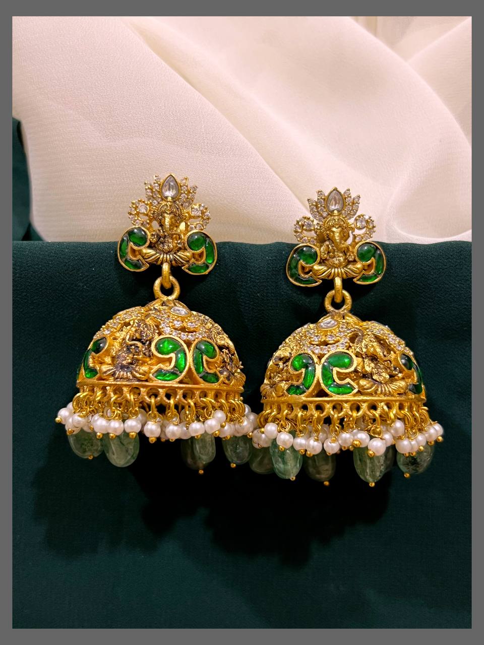 Celebrate tradition with this beautifully detailed Ganesh pendant adorned with elegant Kundan work and delicate jhumki accents. Each piece reflects skilled craftsmanship, making it a meaningful accessory that adds a touch of spirituality and charm to your collection. Perfect for those who appreciate cultural artistry with a graceful finish.