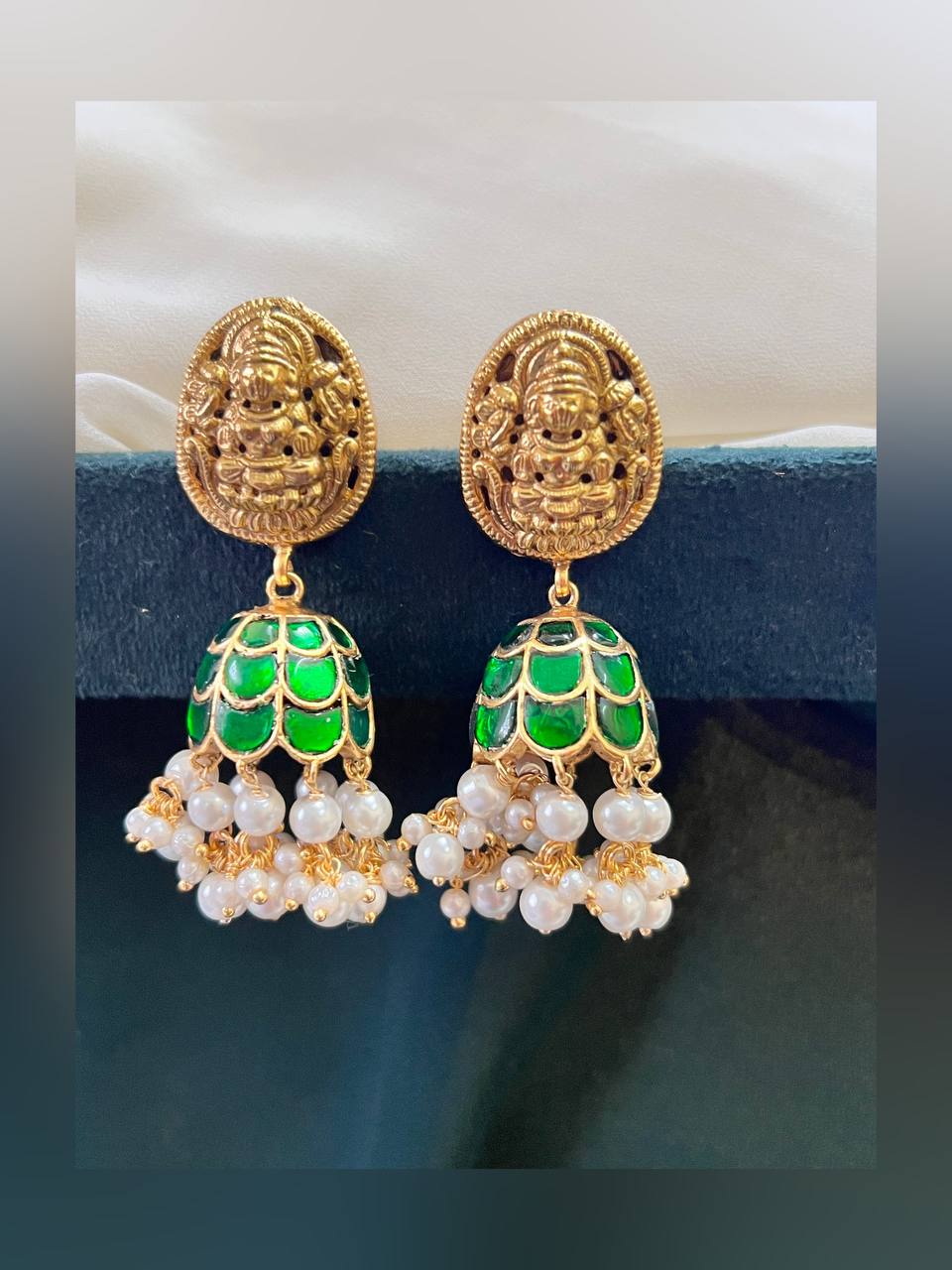 Elevate your accessory collection with this exquisite Beautiful Emerald Jadau Kundan Jimika Earring adorned with intricate JADAV KUNDAN workmanship. This stunning piece combines elegance and tradition, making it a perfect addition to any outfit, whether for a special occasion or everyday wear.