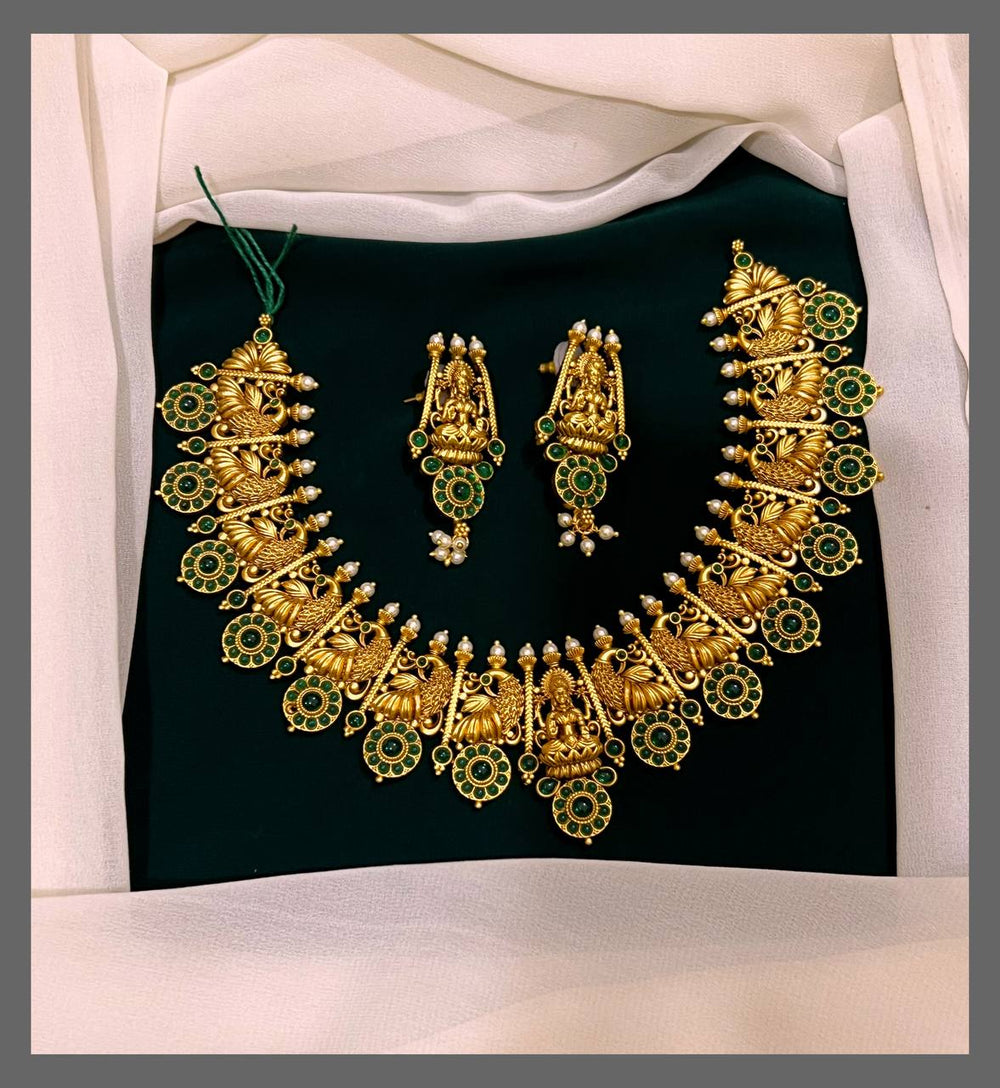 Celebrate tradition and elegance with this Beautiful Emerald Peacock with Lakshmi Necklace in Nakshi design. Crafted to highlight intricate Nakshi artistry, the necklace features a striking peacock motif adorned with vibrant emeralds, symbolizing beauty and prosperity. The central Lakshmi embellishment adds a touch of auspiciousness, making it perfect for special occasions. Embrace a timeless piece that reflects cultural richness while enhancing your graceful presence.