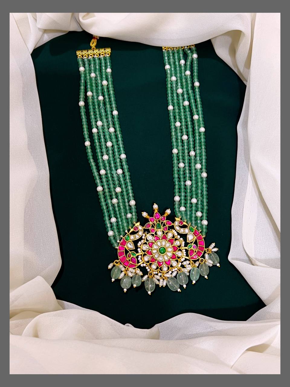 This exquisite emerald pearl pendant set in traditional Kundan craftsmanship offers a timeless elegance perfect for special occasions. The rich green emerald pearl adds a touch of sophistication, while the intricate Kundan work highlights artisanal beauty. Wear it to enhance your style with a graceful and classic accessory that complements both ethnic and contemporary outfits.