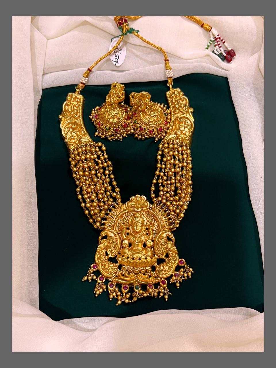 Elevate your traditional collection with this beautiful gold bead necklace featuring an intricately designed Lakshmi pendant in Nakshi style. Its detailed craftsmanship brings a divine touch, making it perfect for festive occasions and celebrations. This necklace blends heritage and elegance, offering you a timeless accessory that complements both ethnic and contemporary outfits with grace.