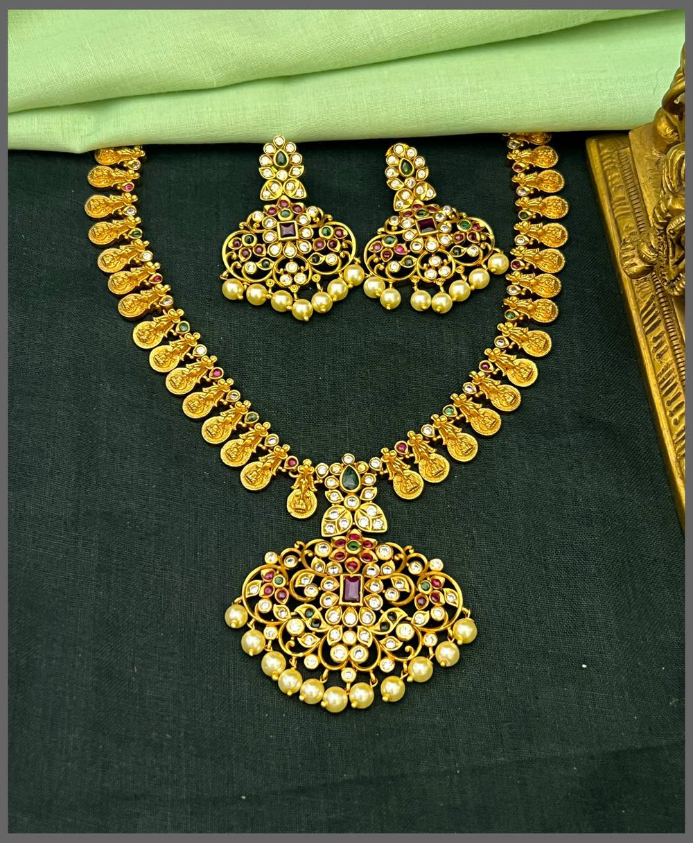 Elevate your traditional jewelry collection with this exquisite Kaasu Lakshmi necklace, a timeless piece that seamlessly blends cultural heritage with refined elegance. Featuring a striking stone pendant set within an ornate Lakshmi design, this necklace captures the essence of prosperity and grace. The intricate craftsmanship showcases traditional artistry, while the stone pendant adds a contemporary touch that complements both festive and everyday wear. Perfect for those who appreciate authentic jewelry that honors classical aesthetics while maintaining modern appeal. An investment piece that celebrates your connection to heritage and style.