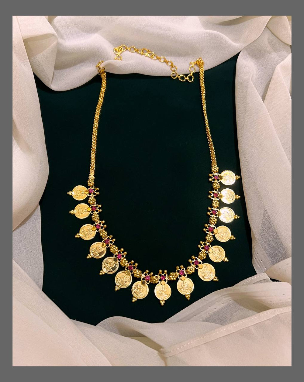 Elevate your look with this Beautiful Kempu Kaasu Chain, expertly crafted to showcase traditional charm with a vibrant red gemstone touch. Its intricate design complements any outfit, making it perfect for both daily wear and special occasions. Comfortable to wear and durable, this chain adds a subtle yet striking appeal to your jewelry collection.