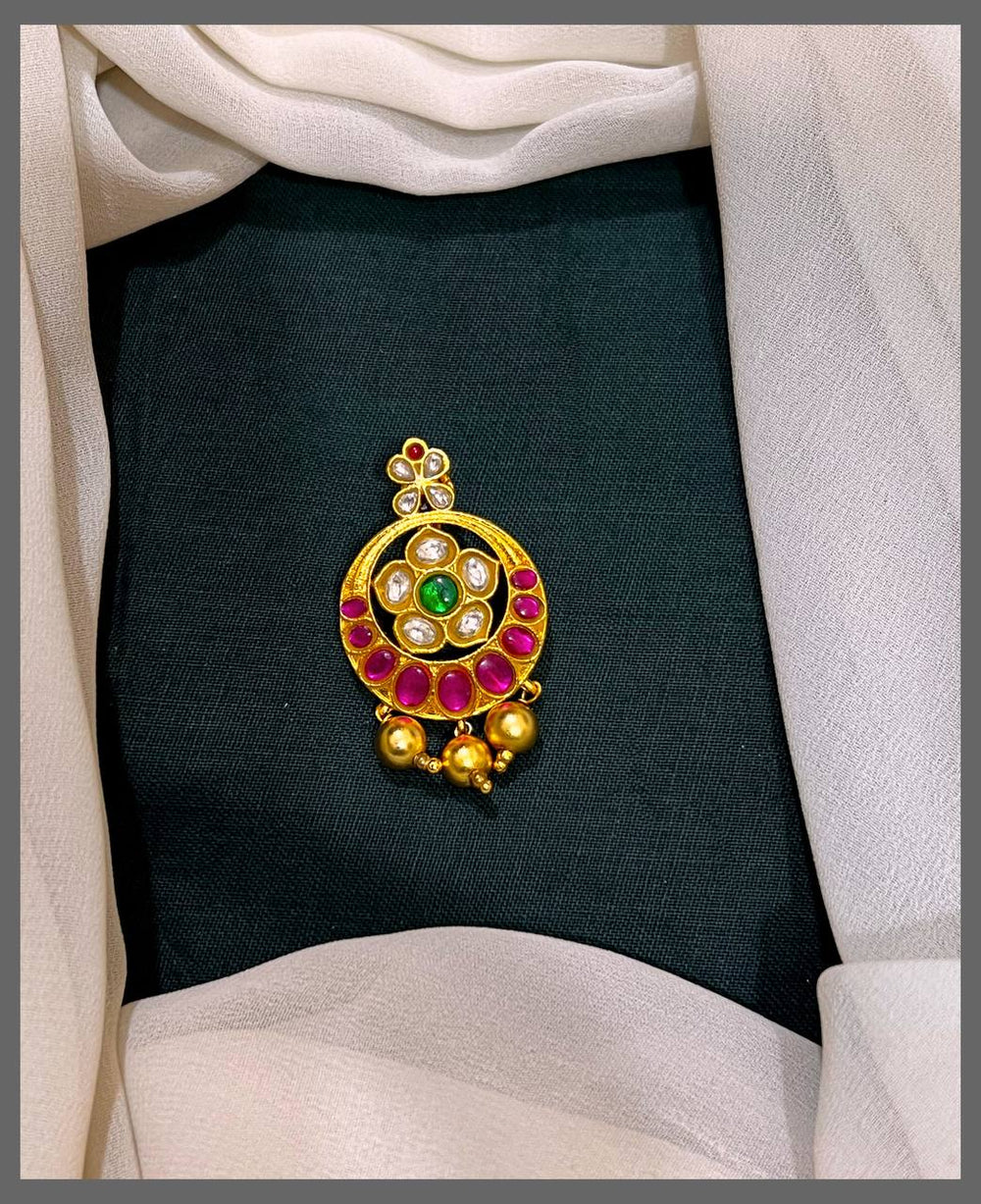 Elevate your jewelry collection with this exquisite Kundan pendant, a timeless piece that celebrates traditional craftsmanship. Featuring intricate kundan work adorned with lustrous stones, this pendant showcases the artistry of skilled artisans. Perfect for special occasions or adding elegance to your everyday style, it pairs beautifully with traditional and contemporary outfits alike. The detailed design and quality craftsmanship make it a cherished addition to any jewelry lover's wardrobe. Wear it with confidence and grace.