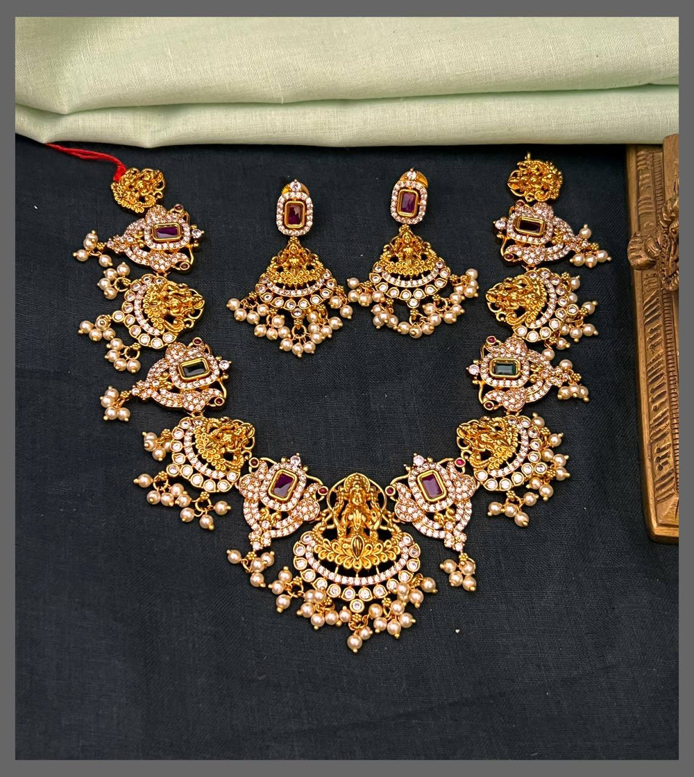 Celebrate divine elegance with this exquisite Lakshmi and Peacock necklace, crafted using traditional Nakshi technique. The intricate design features the goddess of prosperity alongside a graceful peacock, symbolizing beauty and abundance. Each detail is meticulously hand-finished to showcase the artistry of authentic Indian jewelry craftsmanship. Perfect for festive occasions, religious ceremonies, or as a meaningful heirloom piece. This necklace combines spiritual significance with timeless aesthetic appeal, making it an essential addition to any traditional jewelry collection.