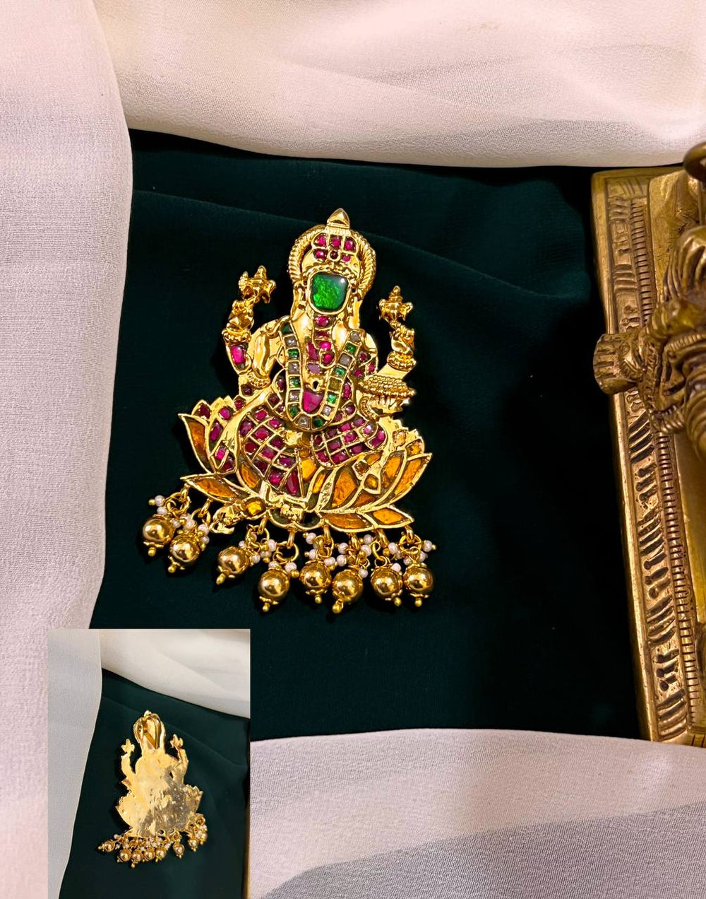 This exquisite Lakshmi Kundan pendant showcases traditional craftsmanship with intricate kundan work that highlights the beauty of the design. Perfect for adding a touch of elegance to any outfit, this pendant symbolizes prosperity and blessings. Its detailed artistry ensures it stands out as a meaningful accessory, ideal