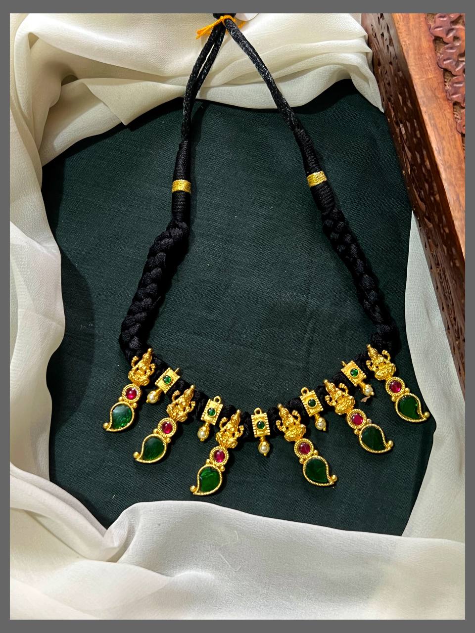 This exquisite pendant necklace features a meticulously crafted Lakshmi motif adorned with traditional mango nakshi detailing, symbolizing prosperity and divine grace. The intricately designed pendant showcases authentic craftsmanship with fine embellishments that capture the essence of classical Indian jewelry artistry. Suspended from a sleek black dori cord, this piece offers versatile styling for both traditional and contemporary occasions. The durable cord ensures comfortable everyday wear while the pendant's timeless design makes it a cherished addition to any jewelry collection. Perfect for those who appreciate heritage-inspired elegance with spiritual significance.