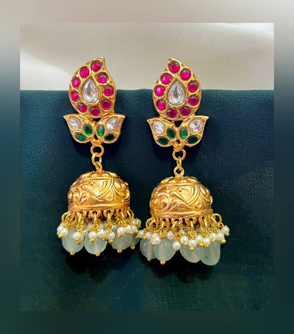 Elevate your accessory collection with this exquisite Beautiful Mango In Multi Jadau Kundan Jimika Earring adorned with intricate JADAV KUNDAN workmanship. This stunning piece combines elegance and tradition, making it a perfect addition to any outfit, whether for a special occasion or everyday wear.