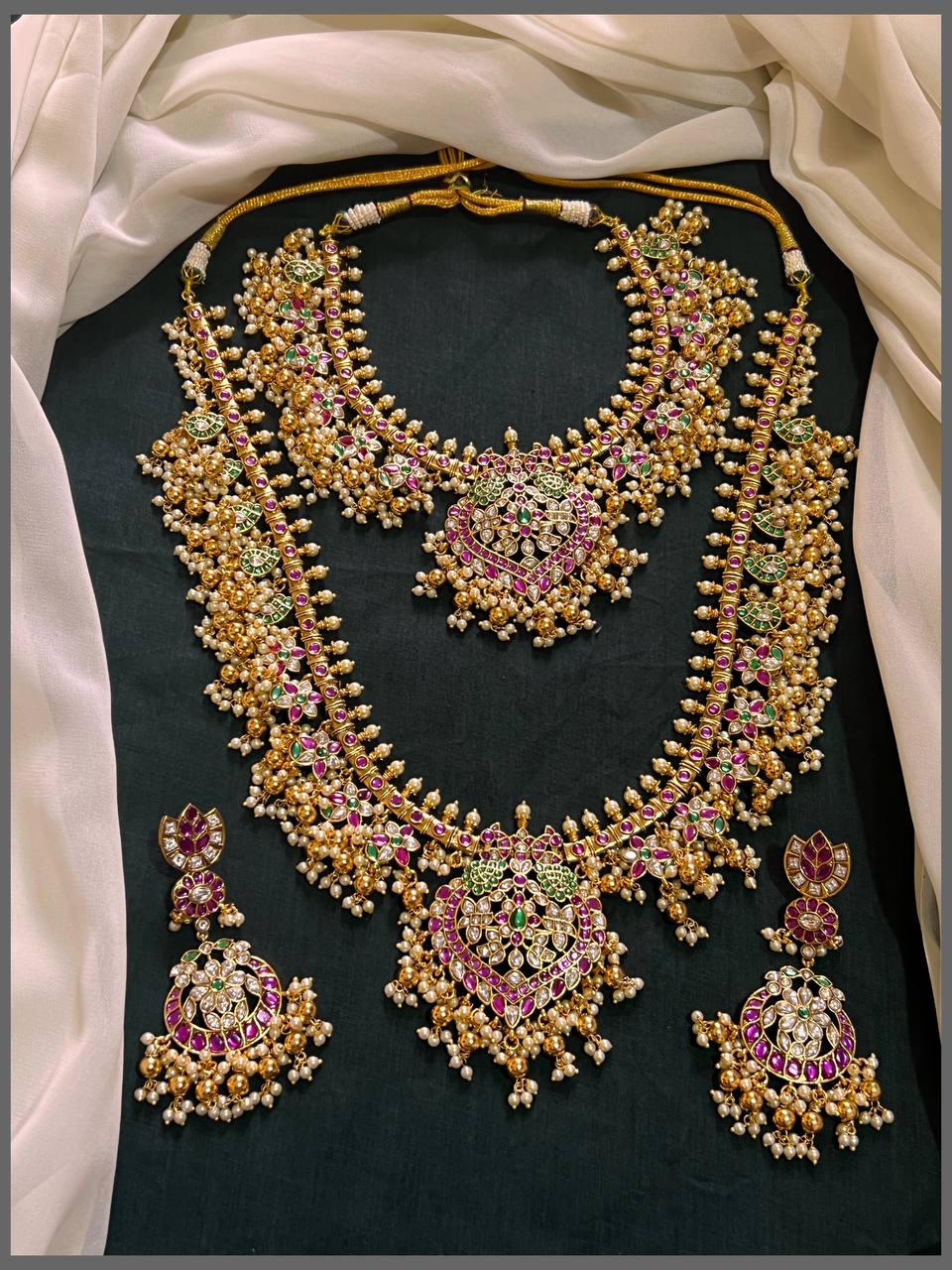 Celebrate your special day with this exquisite bridal set featuring intricate multi-flower designs adorned with traditional Kundan work. The stunning peacock pendant serves as the centerpiece, symbolizing grace and elegance. Each piece is meticulously crafted to complement your bridal ensemble, blending timeless artistry with sophisticated design. Perfect for weddings and festive occasions, this set captures the essence of classic Indian jewelry craftsmanship. Wear it with confidence and let your natural beauty shine through this magnificent creation.