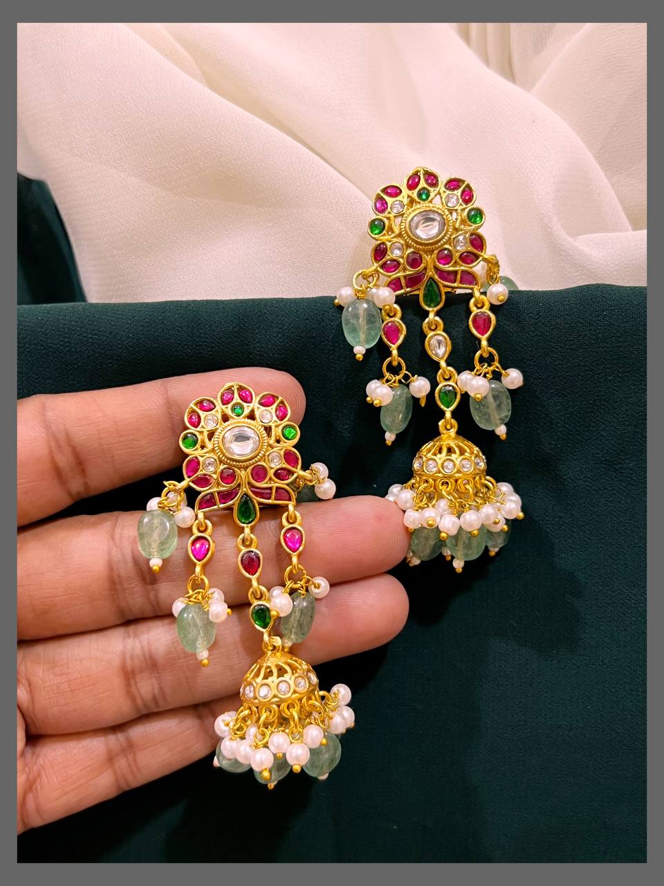 These delicate multi-flower jhumki earrings in Kundan craftsmanship add graceful charm to any outfit. Their small, hugging design offers a comfortable fit while enhancing your look with intricate floral details. Perfect for both daily wear and special occasions, these earrings bring timeless elegance and subtle sparkle to your jewelry collection.