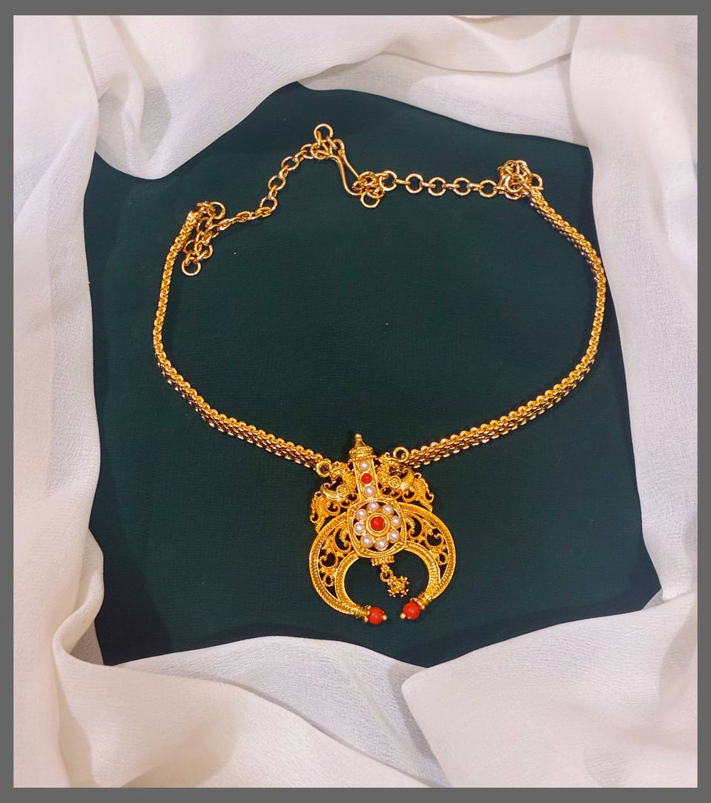 This elegant necklace features a stunning double peacock pendant intricately crafted in Nakshi design. Its detailed artistry highlights traditional motifs that add a graceful touch to any outfit. Perfect for special occasions or enhancing everyday style, this necklace offers a unique blend of cultural charm and timeless beauty.