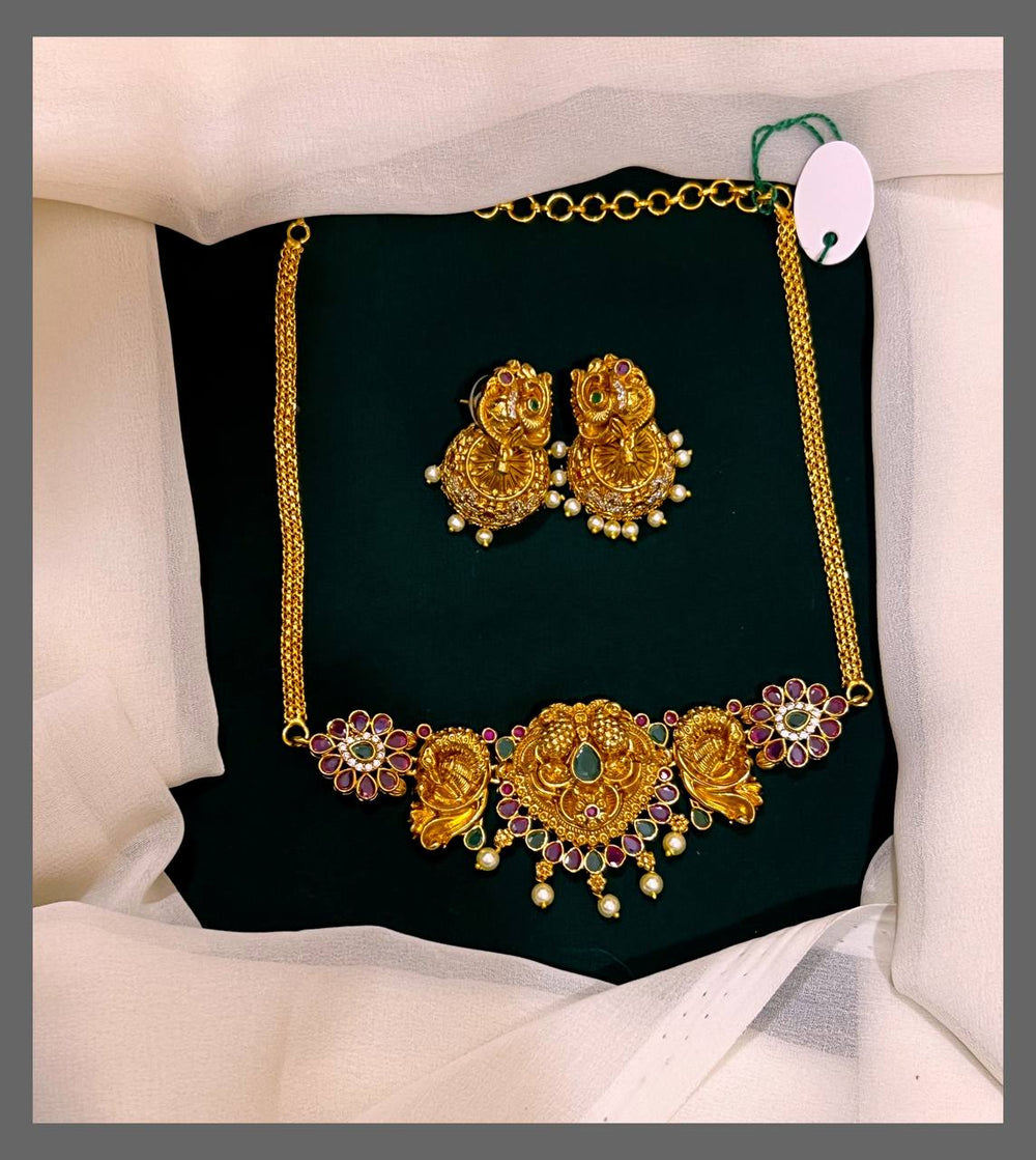 This Beautiful Necklace With Jhumki In Nakshi - NN00404 showcases intricate craftsmanship with detailed Nakshi work, complemented by charming jhumki earrings. Designed to elevate any traditional outfit, it adds elegance and a touch of cultural grace to your look. Perfect for special occasions, this set offers a timeless appeal that blends artistry with wearable beauty.