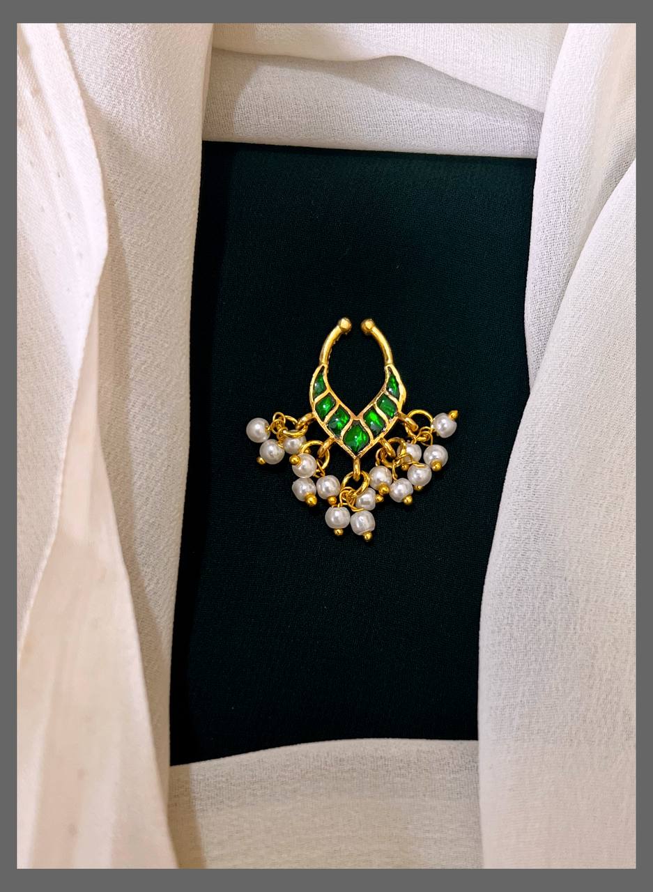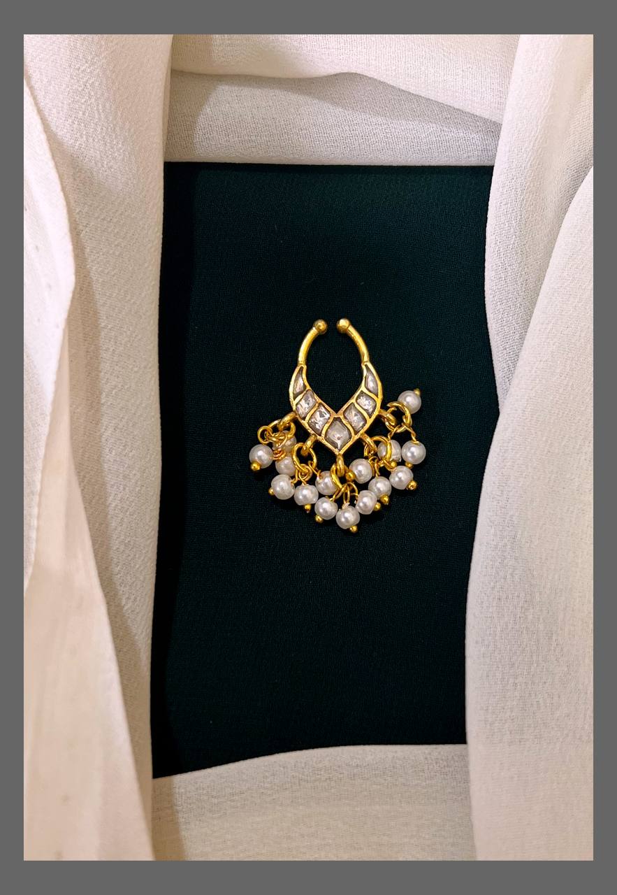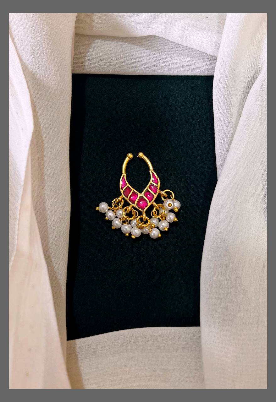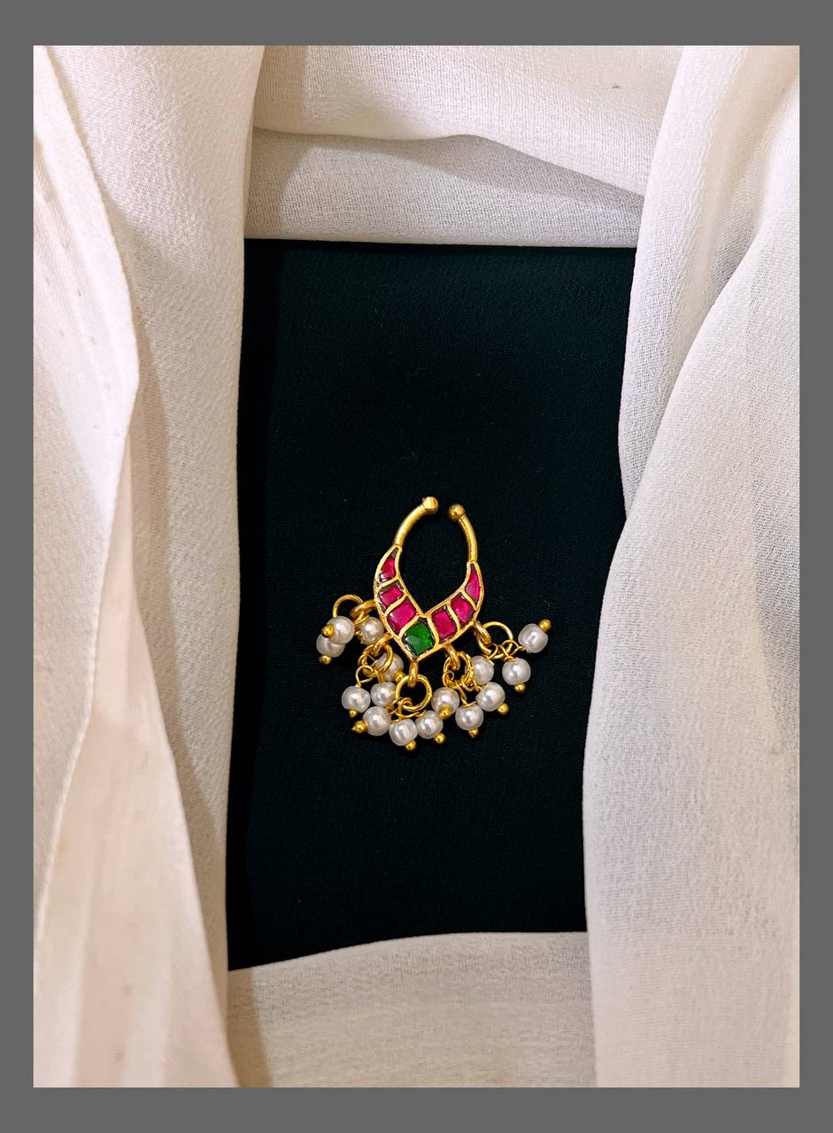 Enhance your traditional look with this Beautiful Nose Ring With Pearls. Designed for comfort and style, it features delicate pearls that add a subtle elegance to any outfit. Perfect for special occasions or everyday wear, this nose ring offers a graceful touch that complements your natural beauty.
