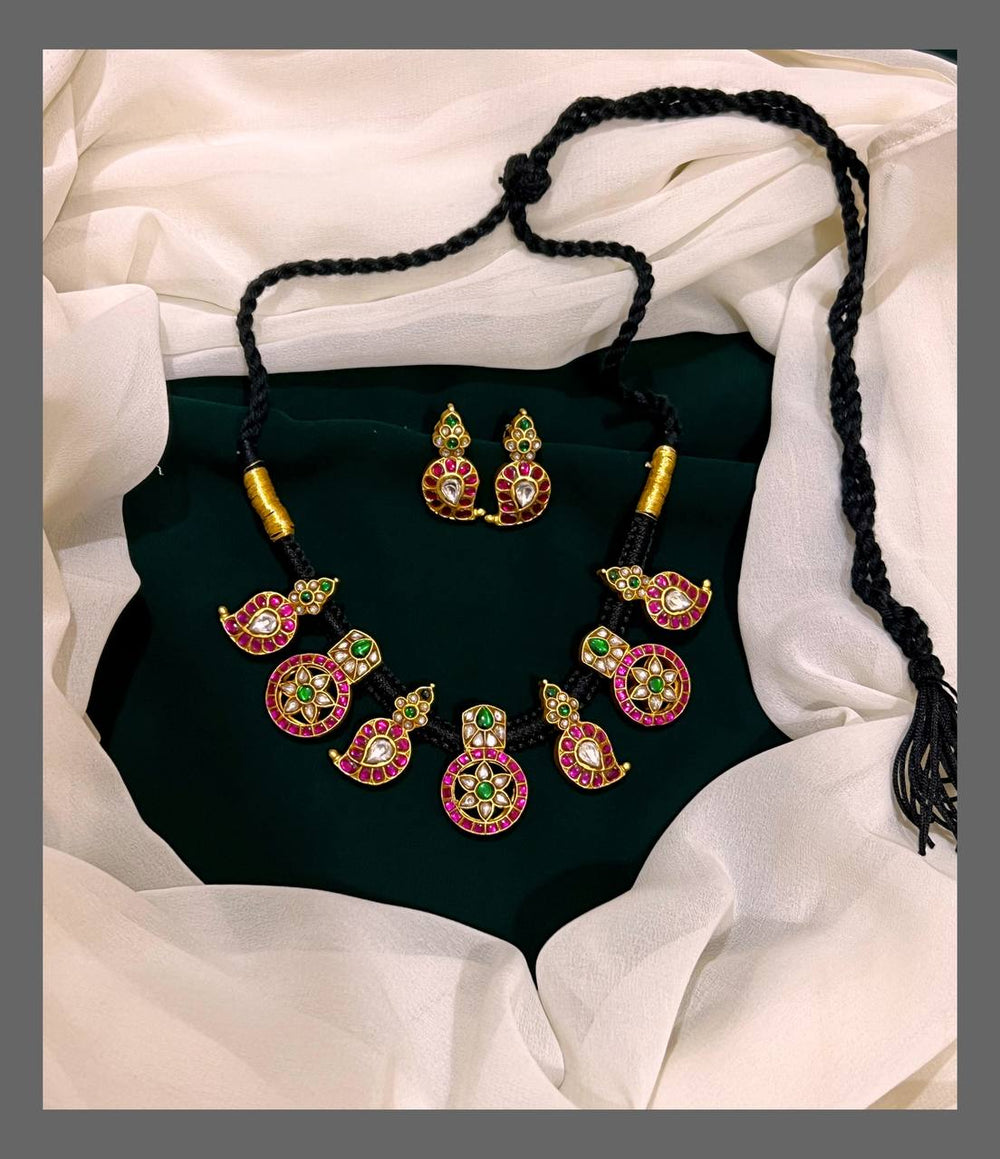 Enhance your ensemble with this Beautiful Pink Flower and Mango Necklace featuring a striking black dori. The delicate pink floral and mango motifs add a charming, traditional touch, while the black dori ensures a comfortable and adjustable fit. Perfect for both casual and festive occasions, this necklace brings elegance and grace to any outfit, supporting your style with a unique handcrafted appeal.
