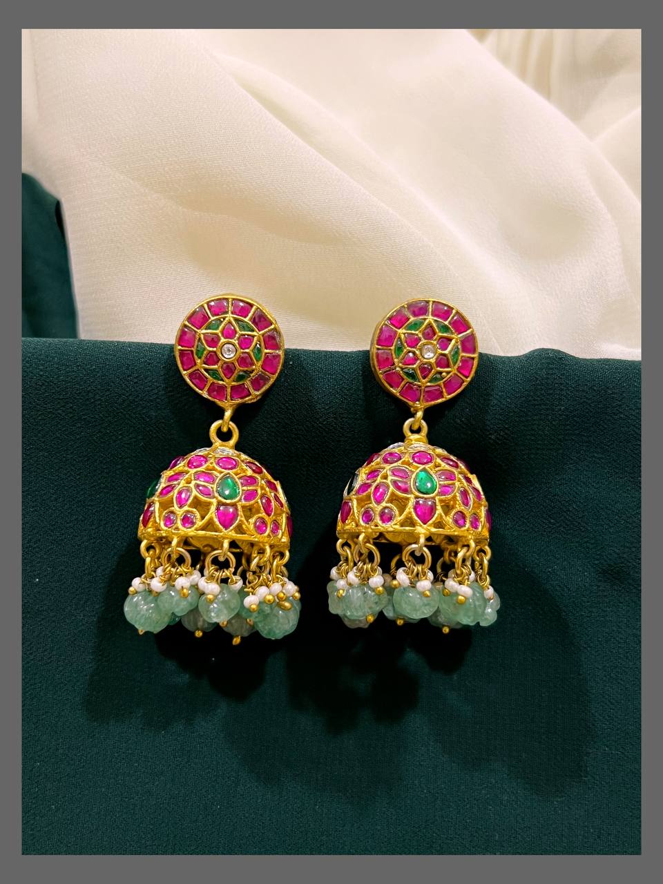 Embrace elegance with this Beautiful Ruby Flower Jhumki crafted in exquisite Kundan work. The vibrant ruby stones arranged in a delicate floral pattern make these earrings a perfect accessory to brighten any outfit. Lightweight and comfortable, they offer a timeless charm suitable for both festive occasions and daily wear, enhancing your style with grace and sophistication.