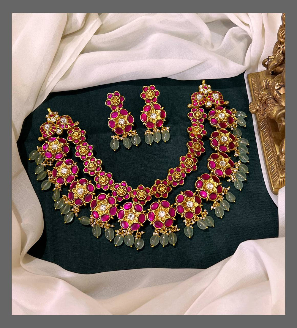 This exquisite Ruby Flower Necklace in Kundan craftsmanship showcases radiant rubies arranged like delicate blossoms, set in traditional Kundan work. Its elegant design adds a touch of timeless beauty to any outfit, making it perfect for special occasions or enhancing everyday style. Comfortable to wear, this necklace brings a subtle yet striking charm to your jewelry collection.