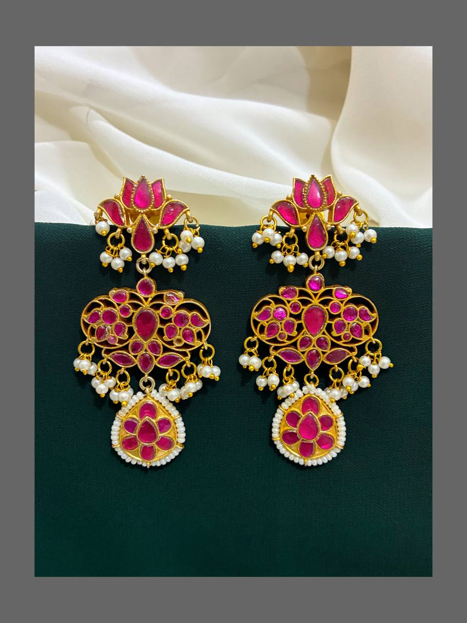 These Beautiful Ruby Lotus Earrings in Kundan showcase exquisite craftsmanship with vibrant ruby stones set in traditional Kundan style. Their elegant lotus design adds a touch of grace, making them perfect for special occasions or enhancing everyday looks. Comfortable to wear, these earrings bring a timeless charm that complements various outfits effortlessly.
