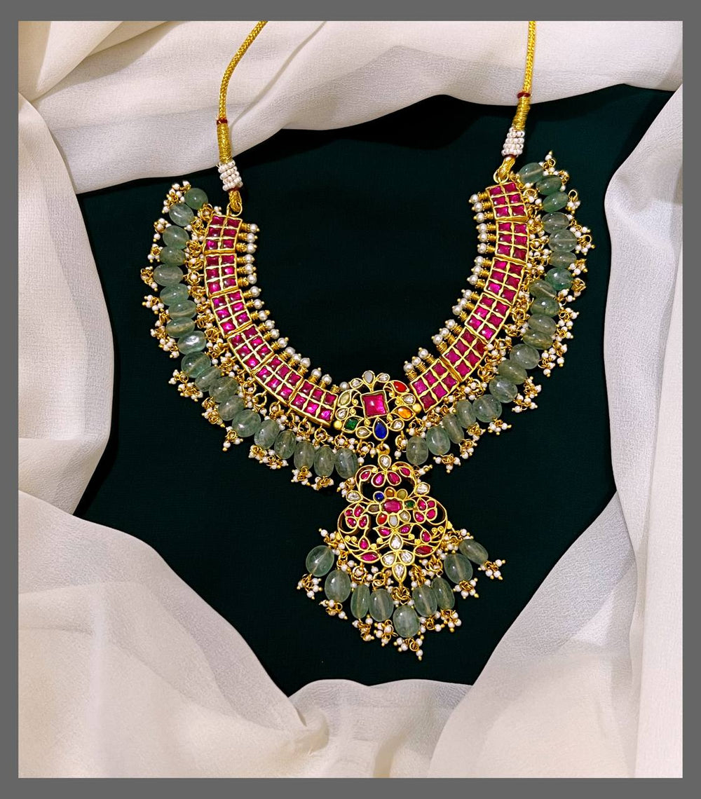 This exquisite ruby necklace crafted in traditional Kundan style adds a touch of timeless elegance to any outfit. The vibrant rubies are beautifully set to enhance their natural brilliance, making it perfect for special occasions or gifting. Its intricate design reflects skilled craftsmanship, ensuring you wear a piece that is both stunning and meaningful.
