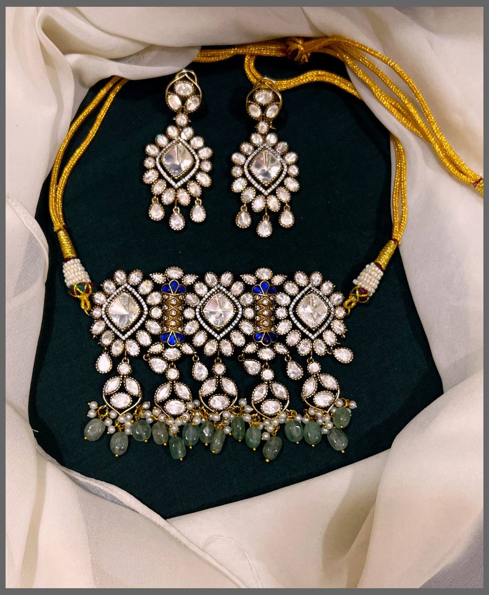 Elevate your traditional look with this stunning white chokar, masterfully crafted in authentic kundan work. The intricate detailing showcases the timeless artistry of kundan jewelry, featuring delicate stone settings that catch light beautifully. Perfect for weddings, festivals, or special occasions, this piece adds an elegant touch to any ethnic ensemble. The white kundan design offers versatility, complementing various outfits while maintaining that classic, sophisticated charm. A treasured addition to your jewelry collection that celebrates heritage craftsmanship.
