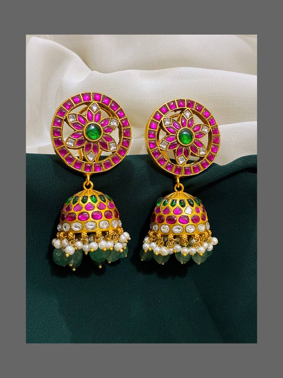 This Big Flower Jimikki in Kundan - KE00184 is an exquisite piece of jewelry that combines traditional design with modern elegance. The intricate kundan work and bold flower design make for a stunning accessory that will elevate any outfit. Handcrafted and unique, this Jimikki is a must-have for any jewelry collection.