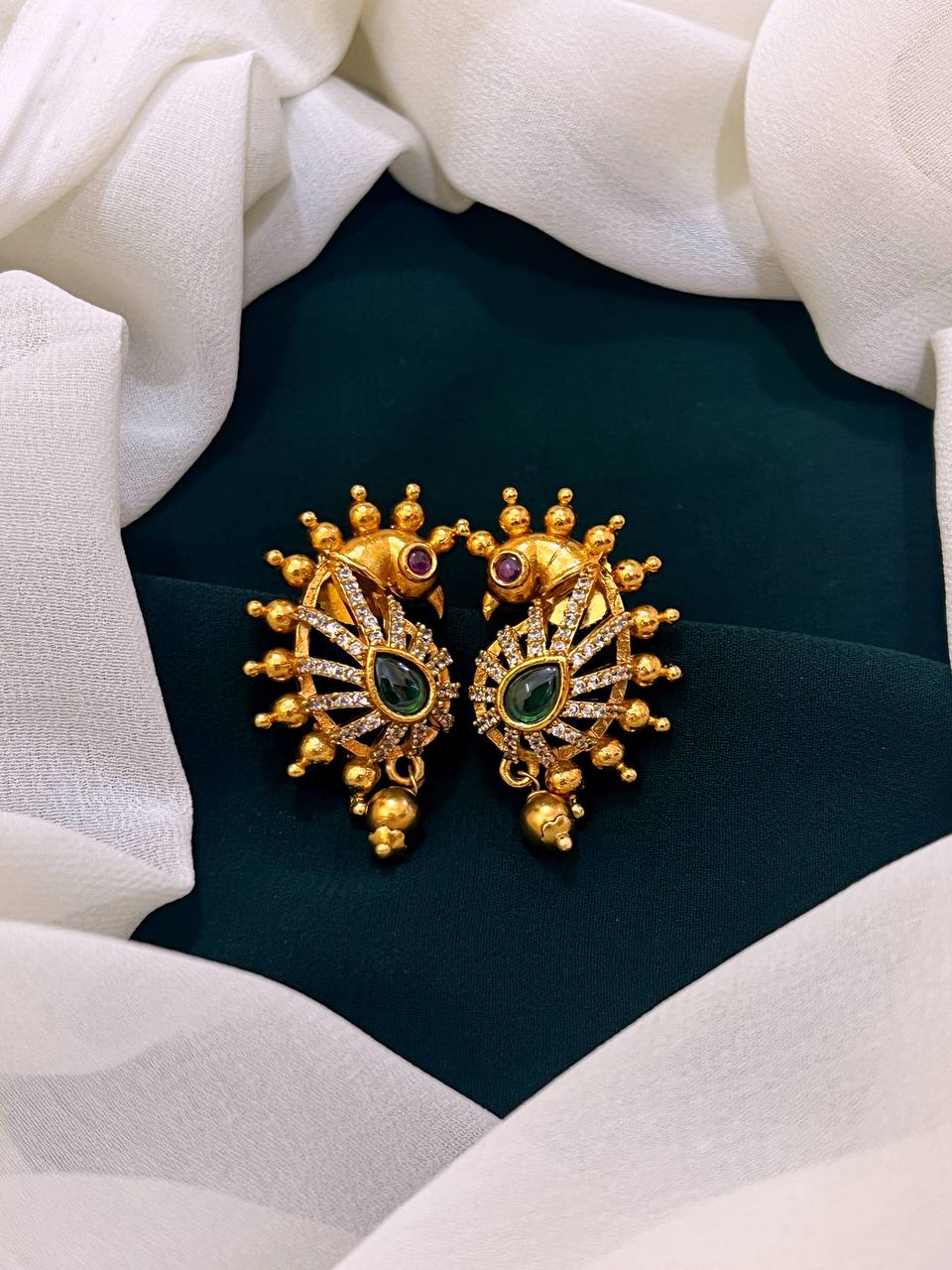 Beautiful Big Peacock Eyes in Ruby, Body in White Small Stone in the middle Emerald, Back push