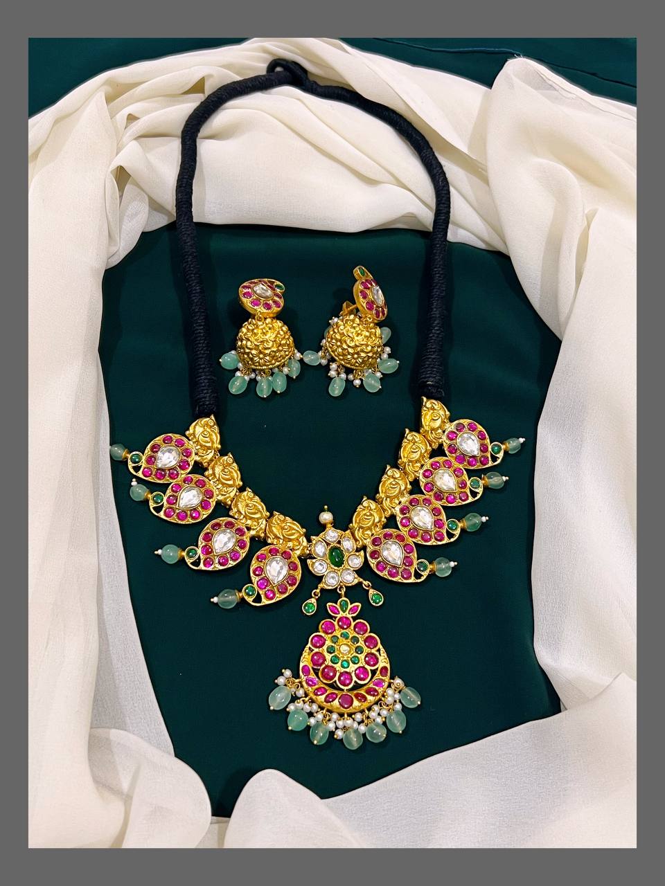 Elevate your traditional look with this Black Dori Mango Haram featuring a stunning Kundan pendant. The intricate mango-shaped design paired with the rich black dori thread offers a perfect blend of elegance and cultural charm. Lightweight and comfortable, this necklace is ideal for festive occasions and special celebrations, adding a graceful touch to your ensemble.