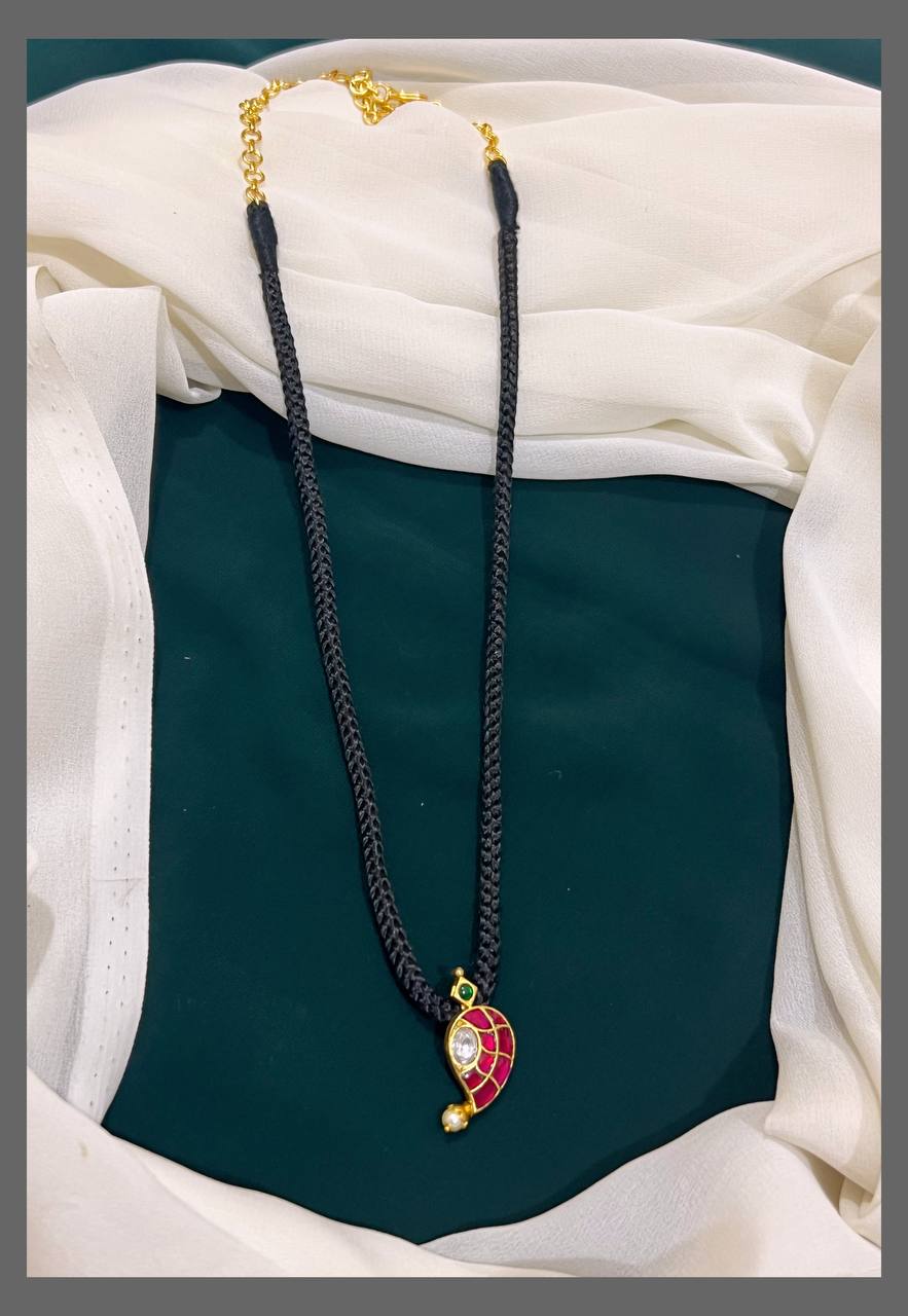 Black Thread KundanPendant NecklaceFeatures:Color: RubyStyle: RoundMaterial: Jadau, Black ThreadEarrings: NoExperience: Lightweight and comfortable to wearUsage: Everyday Celebration use