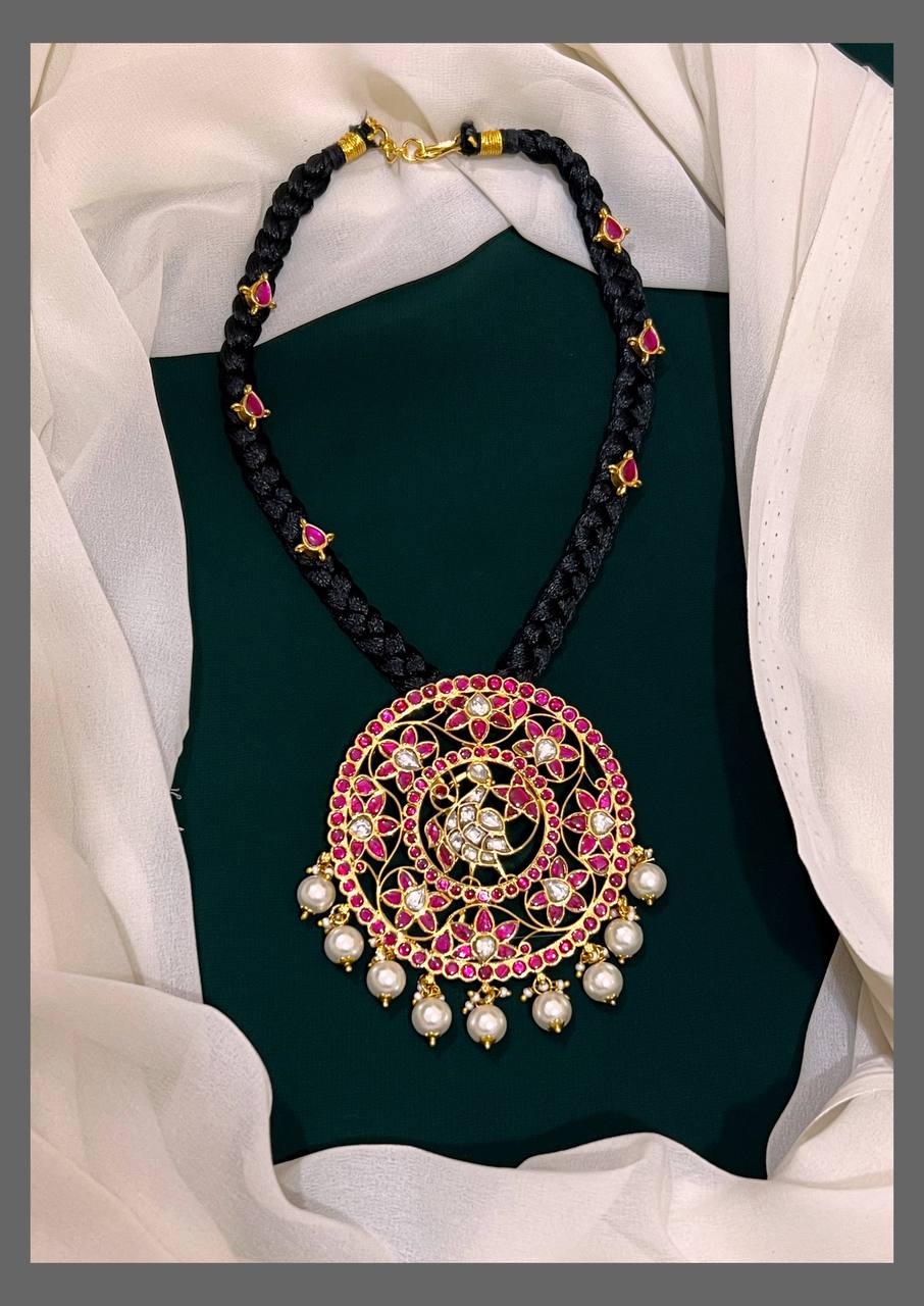 This elegant Black Dori featuring a beautiful Kundan pendant adds a touch of traditional charm to any outfit. The rich black thread complements the intricate Kundan work, making it perfect for both casual and festive occasions. Lightweight and adjustable, it ensures comfortable wear throughout the day while enhancing your style with a classic Indian appeal.