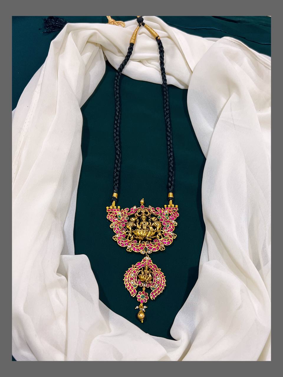 This elegant Black Dori features a beautifully crafted Lakshmi Kundan pendant, symbolizing prosperity and good fortune. The traditional design paired with the sturdy black thread makes it perfect for daily wear or special occasions, offering both style and cultural significance. A meaningful accessory that complements any outfit with grace and charm.