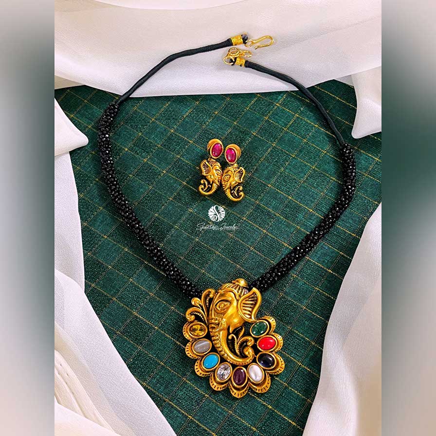 Features: Color: Multicolor Style: Navratana Genesha Pendant Material: Brass, Thread Earrings: Yes Experience: Lightweight and comfortable to wear Usage: Great for traditional events and festive seasons