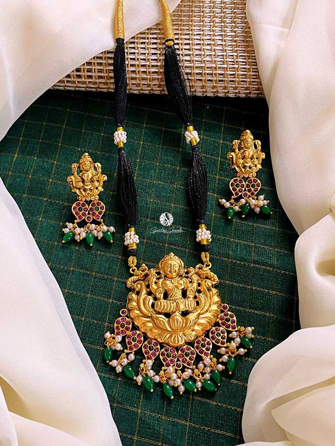 Features: Color: Golden, Emerald Style: Laxmi Pendant Material: Brass, Thread, Jadau Earrings: Yes Experience: Lightweight and comfortable to wear Usage: Great for traditional events and festive seasons
