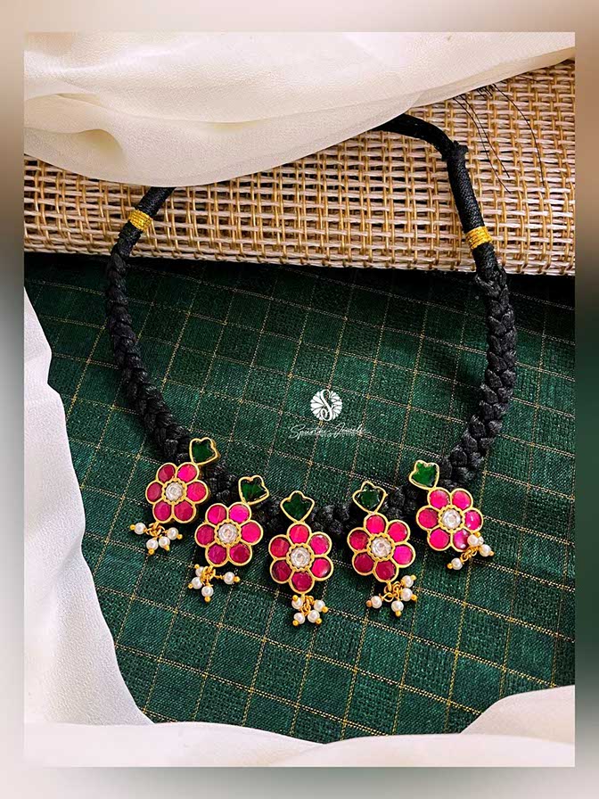 Features: Color: Ruby Style: Flower Pendant Material: Brass, Thread Earrings: Yes Experience: Lightweight and comfortable to wear Usage: Great for traditional events and festive seasons
