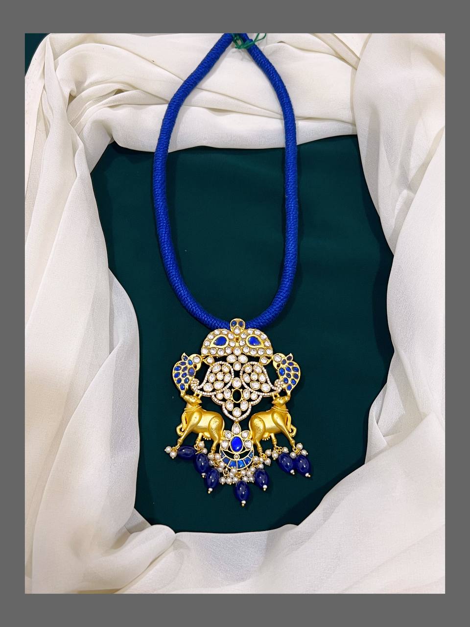 This Blue Dori with Kundan Pendant combines traditional charm with elegant design. The vibrant blue thread complements the intricate Kundan work, making it a perfect accessory for festive occasions or daily wear. Lightweight and comfortable, it adds a subtle yet striking touch to your outfit, enhancing your natural grace with every wear.