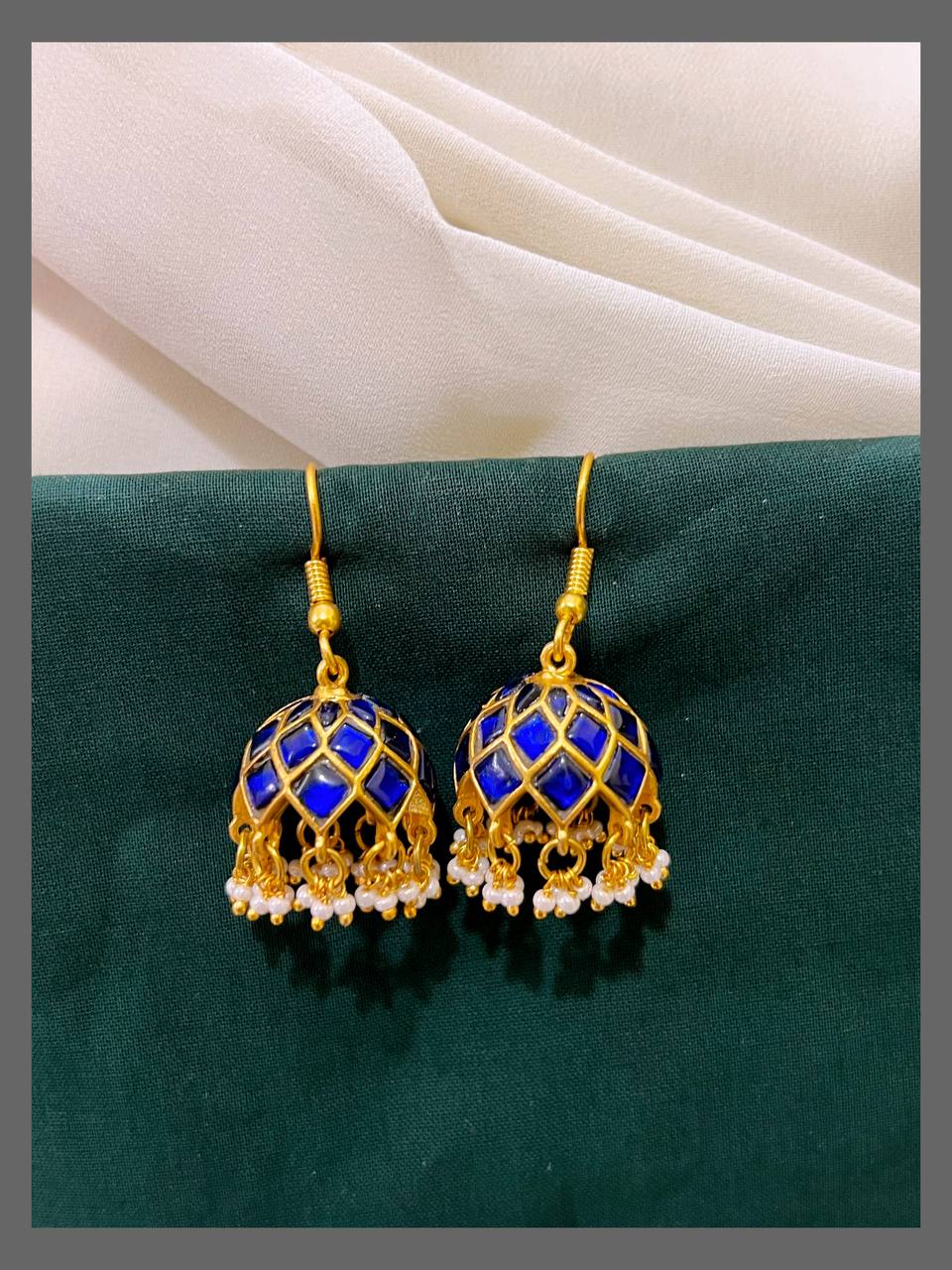 Elevate your elegance with the Blue Hugging Jhumki Earring in Kundan. This delicately crafted piece features a soothing blue hue accented by traditional Kundan work, offering a timeless charm. Its intricate design gently embraces your earlobes, perfect for adding a graceful touch to both everyday and festive outfits. Comfortable to wear and striking in appearance, these earrings are a beautiful way to express your unique style.