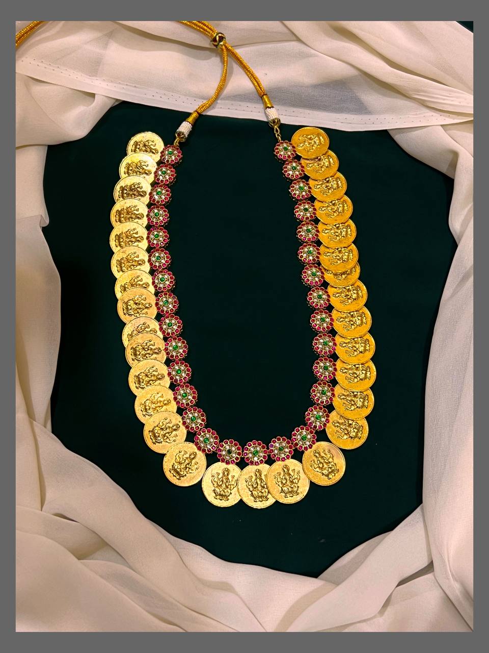 This Bottu and Lakshmi Kasu Kundan Haram features intricate craftsmanship with traditional Kasu and Kundan work, highlighting timeless elegance. Designed to complement both festive and formal attire, it adds a graceful touch to your ensemble while honoring classic jewelry artistry. Comfortable to wear and striking in appearance, this haram is a beautiful choice for special occasions, celebrating heritage with sophistication.
