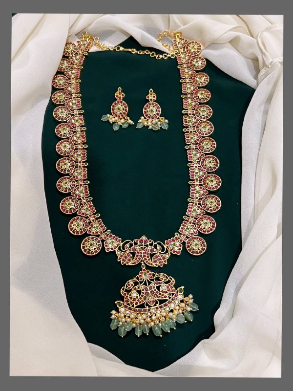 This Bottu Mala features a stunning peacock pendant crafted in exquisite Nakshi work, blending traditional artistry with elegant design. Perfect for adding a touch of cultural charm to your attire, this necklace complements both festive and formal occasions. Its intricate detailing and vibrant finish make it a cherished piece that enhances your style with grace and sophistication.