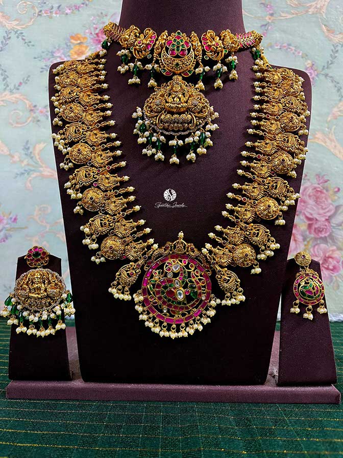 Bridal Set with Long and Short Temple Jewellery with Earring and Mang Tika Features: Color: Ruby, Sky Blue Style: Long and Short Lamx Pendant Material: Brass, Beads, Jadau Earrings: Yes Experience: Lightweight and comfortable to wear Usage: Bridal and wedding