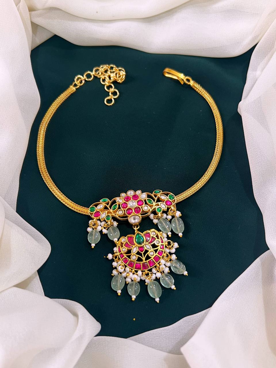Elevate your accessory collection with this exquisite Chand bail Lotus Jadav Kundan Multi Necklace adorned with intricate JADAV KUNDAN workmanship. This stunning piece combines elegance and tradition, making it a perfect addition to any outfit, whether for a special occasion or everyday wear.