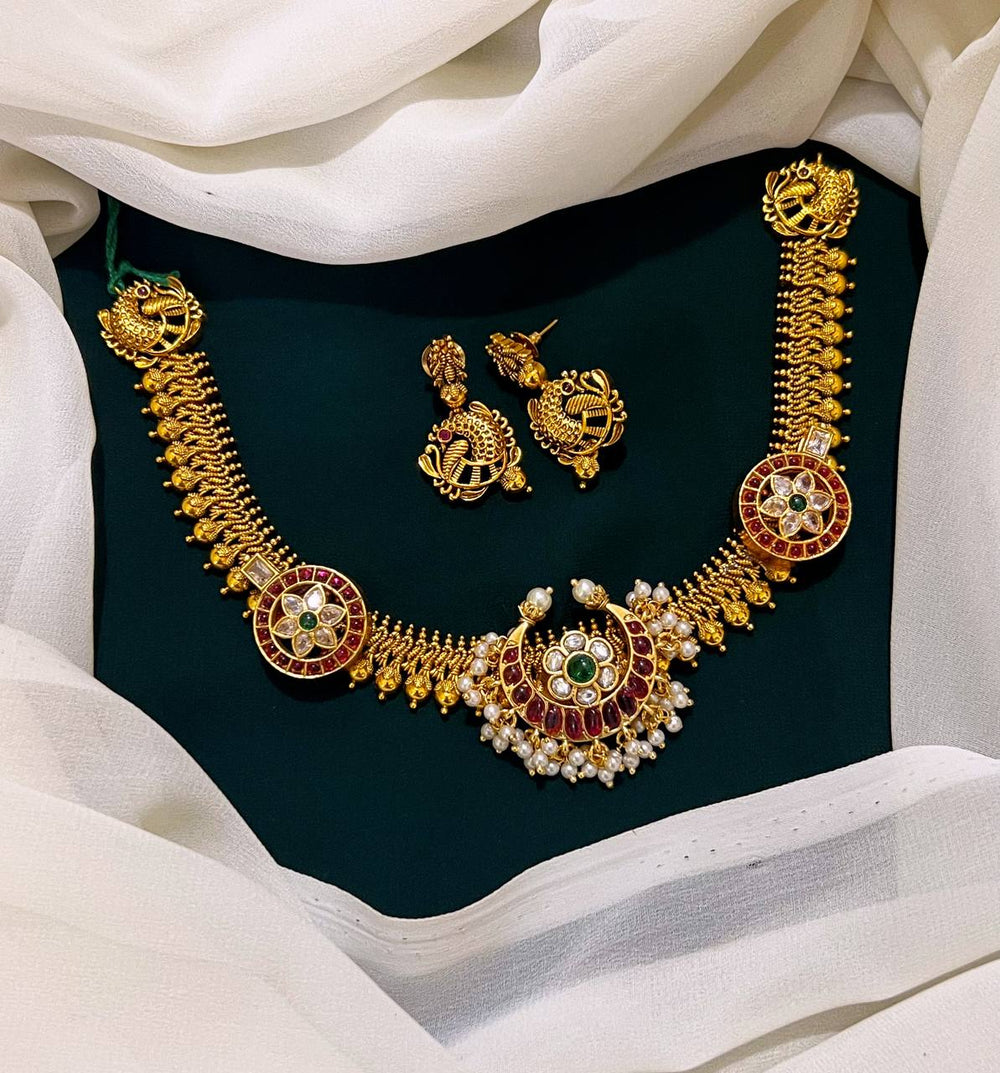 Enhance your traditional collection with this exquisite Chand Bali Pendant paired with a Butto Necklace, crafted in intricate Nakshi work. The detailed design highlights timeless elegance, perfect for adding a graceful touch to any outfit. Comfortable to wear yet striking in appearance, this set offers both style and cultural richness to complement your jewelry wardrobe.