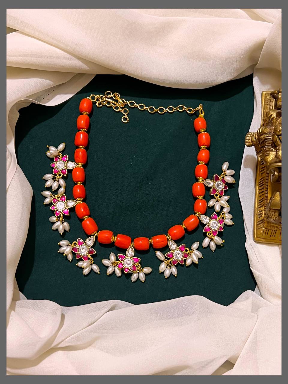Elevate your jewelry collection with this exquisite Coral Beads With Kundan Small Pendant. Featuring vibrant coral beads paired with intricate kundan work, this delicate piece brings timeless elegance to any occasion. The small pendant design makes it versatile enough for daily wear or special celebrations, while the traditional kundan craftsmanship adds a touch of authentic Indian artistry. Perfect for those who appreciate the beauty of natural materials combined with skilled artisanal techniques. A stunning addition that complements both traditional and contemporary styles.