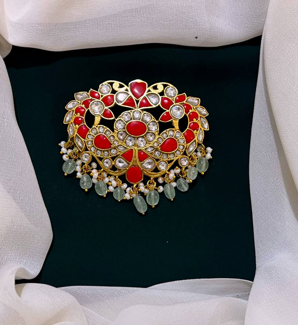 This coral pendant in kundan, KP0068, is a stunning addition to any jewelry collection. Handcrafted with exquisite attention to detail, its intricate design and vibrant colors are sure to make a statement. Made with high-quality materials, this pendant is both durable and beautiful. Elevate any outfit with this unique piece.