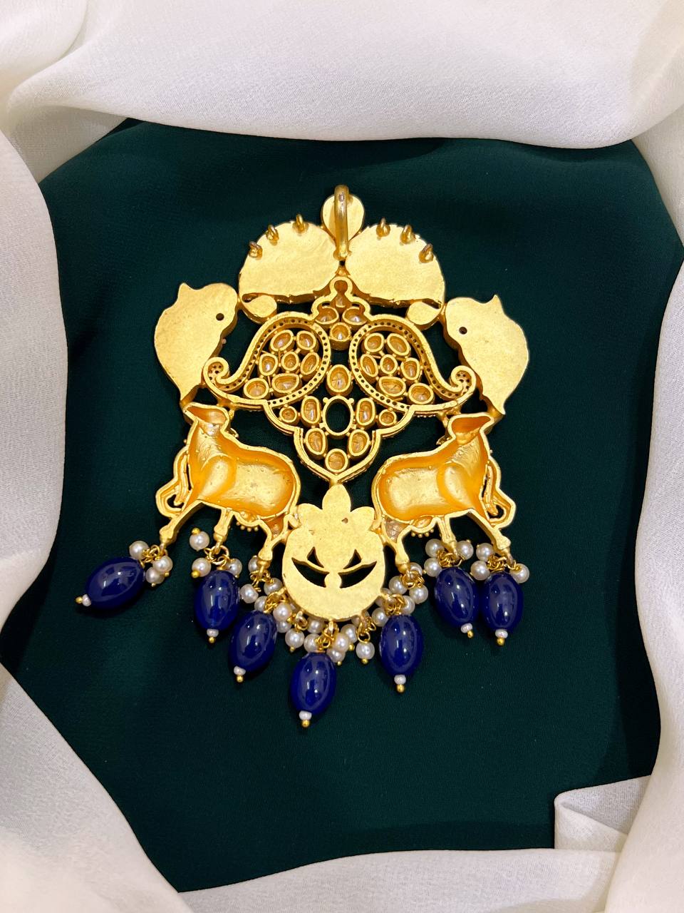 Elevate your accessory collection with this exquisite Cow Pendent in Jadau Kundan adorned with intricate Kundan workmanship. This stunning piece combines elegance and tradition, making it a perfect addition to any outfit, whether for a special occasion or everyday wear.